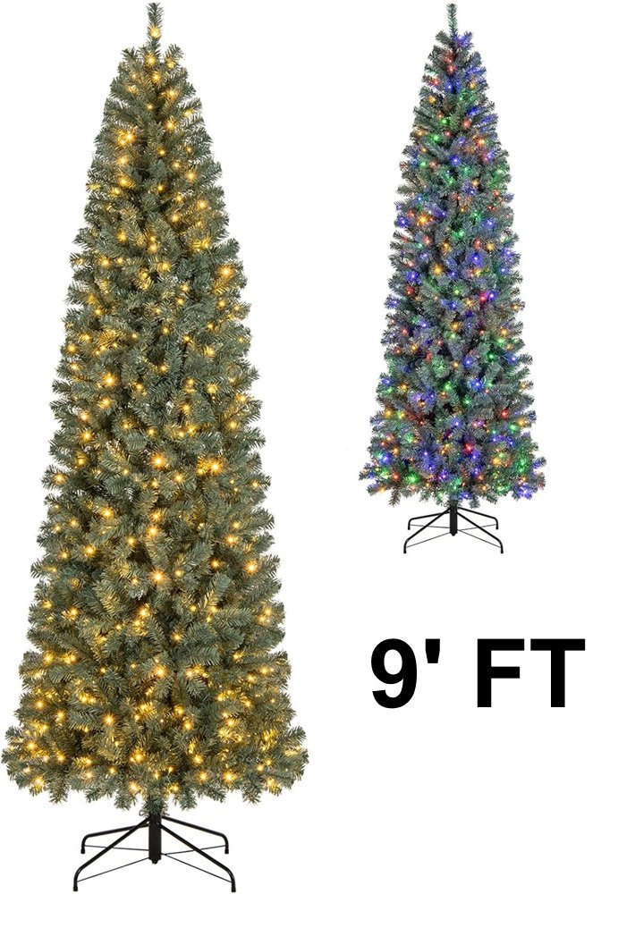 HAPPYGRILL Pre-lit Pencil Christmas Tree Hinged Artificial Xmas 1168 Blue Branch Tips 500 Warm White Multi-Color LED Lights - 9' FEET (model: CM24776US-XL)