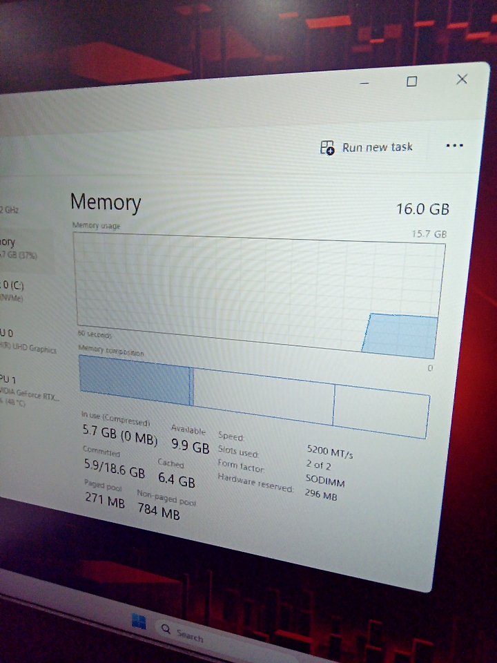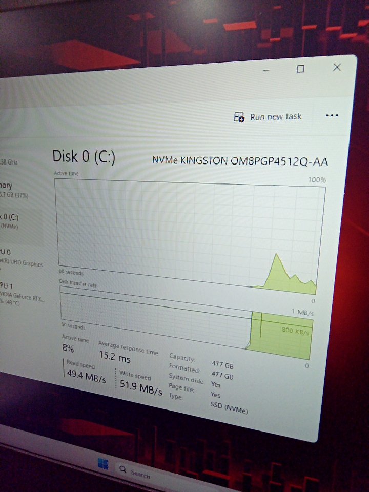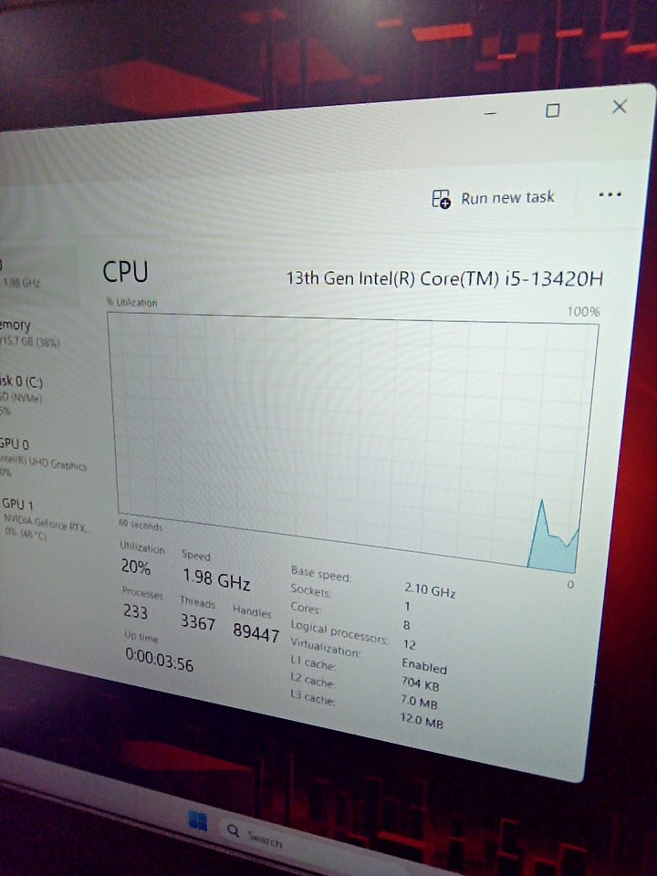 Tested for basic windows setup. Tested for power and laptop specifications through task manager/settings. (SEE PHOTOS)