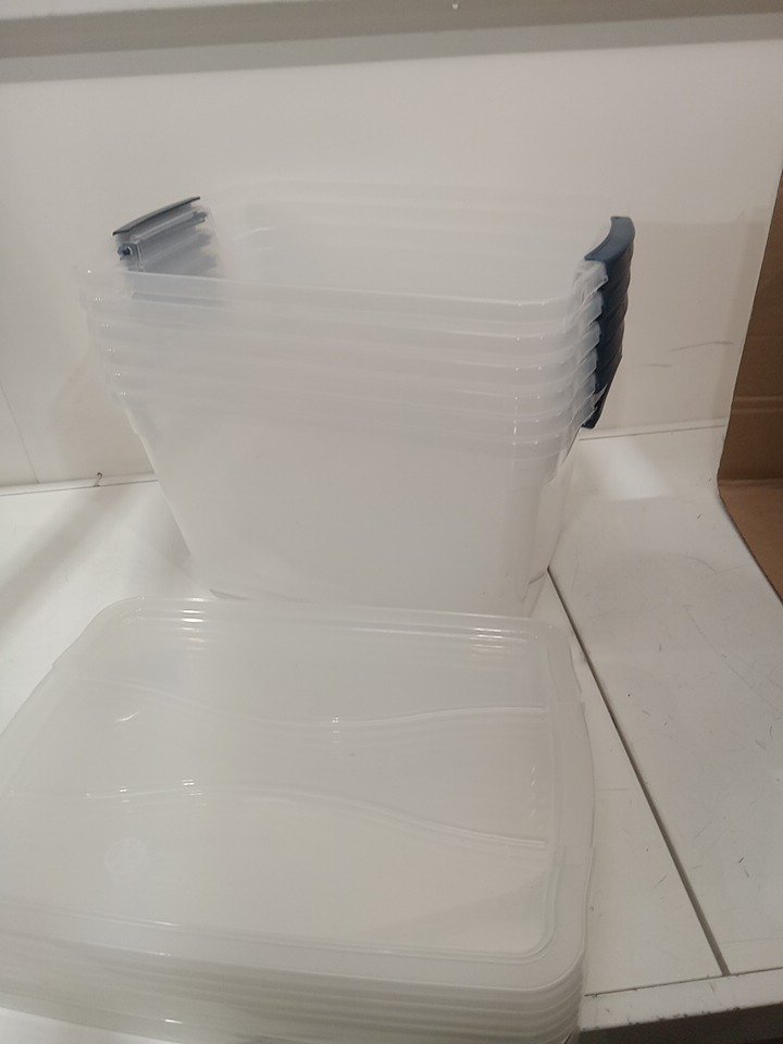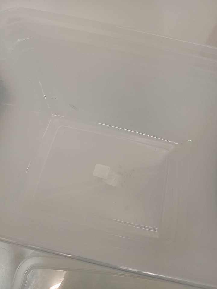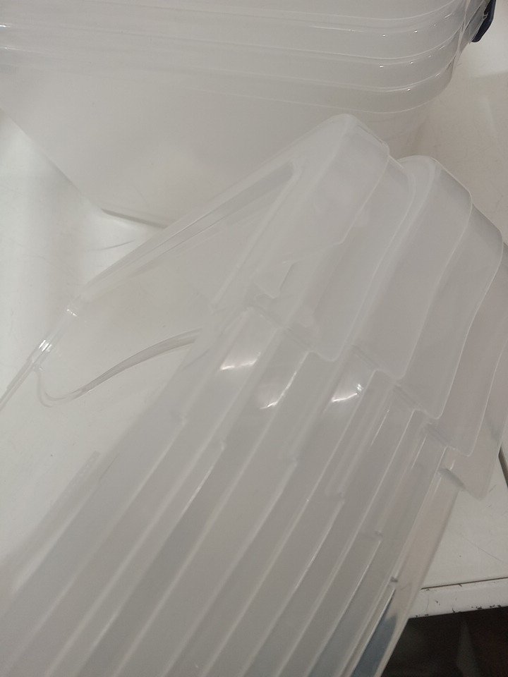 One of the lids is cracked on the side. Has some paper clips/debris in it from previous use and can likely be cleaned.