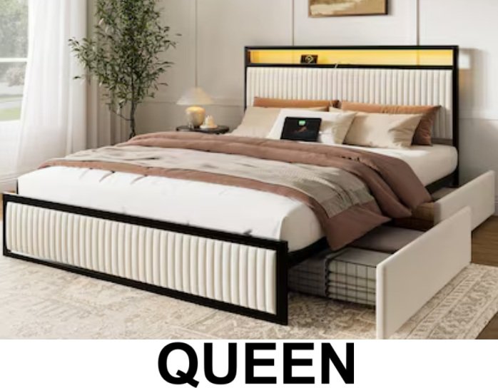 hausource Upholstered platform Bed Frame with LED Headboard, 2 storage Drawers and Charging Station - queen - beige (model: HB0173BG0