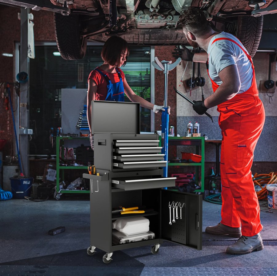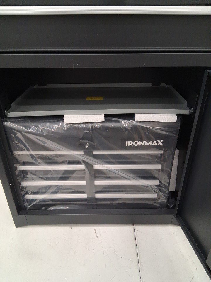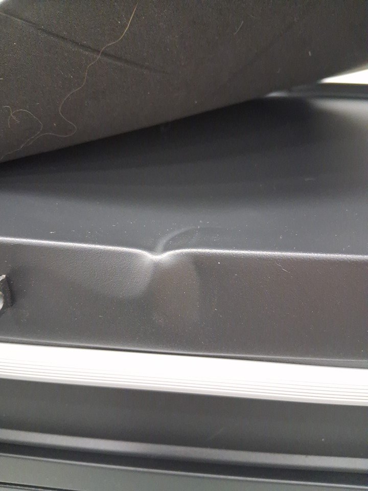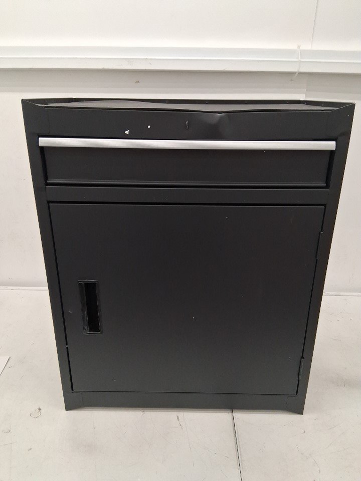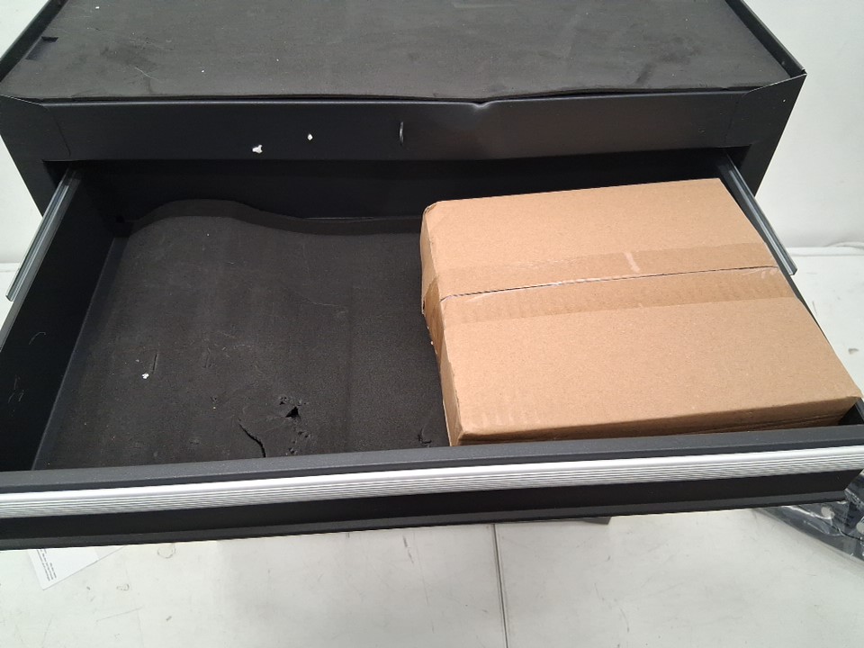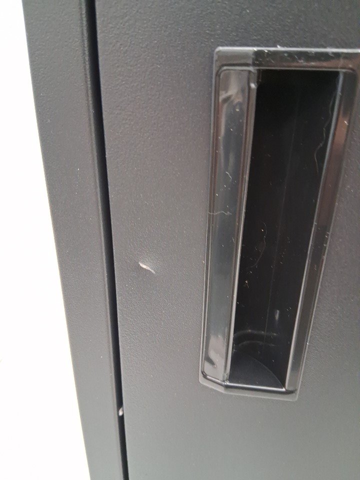 Due to shipping, there is a small dent in the top of the rolling cabinet and a scuff on the front of the door, as well as some scratches on the metal piece that locks the door in place. Outside of this cosmetic damage, appears unused with no issues that would impede function - see photos.