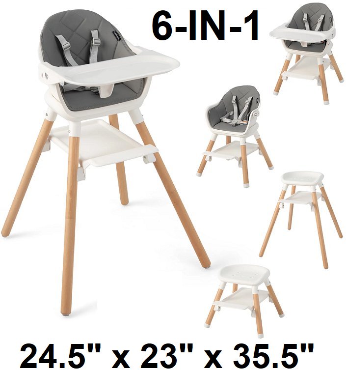 Costway 6-in-1 Convertible Wooden Baby Highchair WITH REMOVABLE TRAY - 24.5" x 23" x 35.5" - WHITE/grey - (MODEL:BE10071GR)