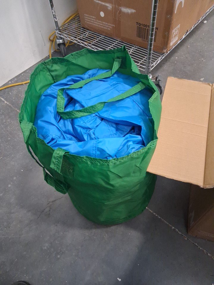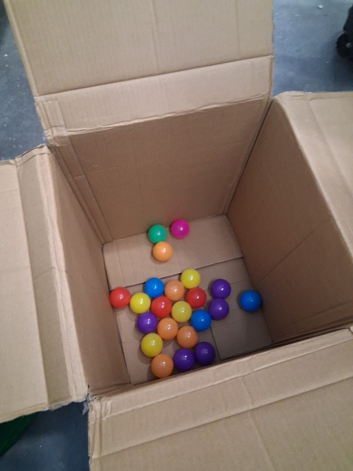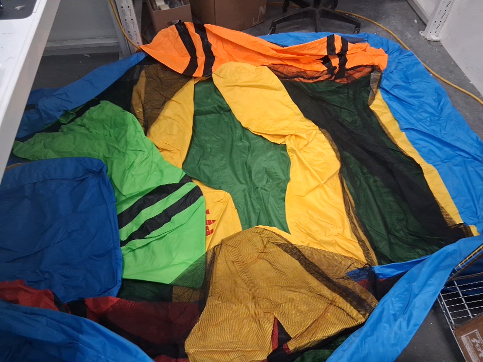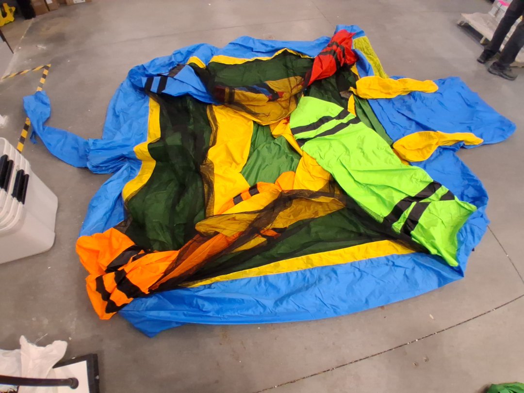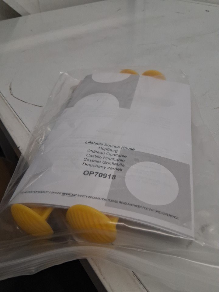 Blower not included, a large number of balls are missing. From what can be seen there is no rips and or tears, this product has been inspected to the best of ability without a blower, may be dust on bounce castle due to laying on warehouse floor.