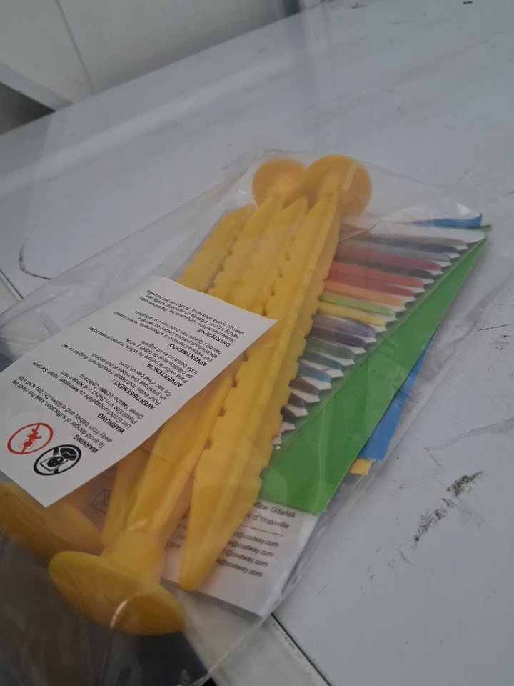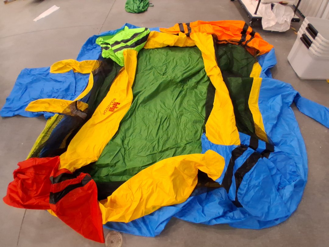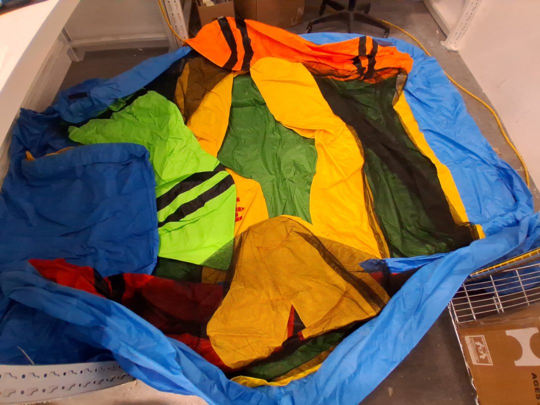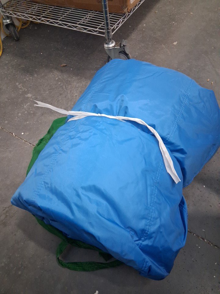 Blower not included, a large number of balls are missing. From what can be seen there is no rips and or tears, this product has been inspected to the best of ability without a blower, may be dust on bounce castle due to laying on warehouse floor.