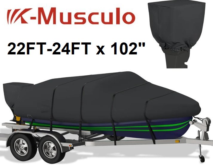 K-Musculo Boat Cover TARP , Heavy Duty 800D Waterproof Fits V-Hull, Tri-Hull - 22ft-24ft x 102" - black