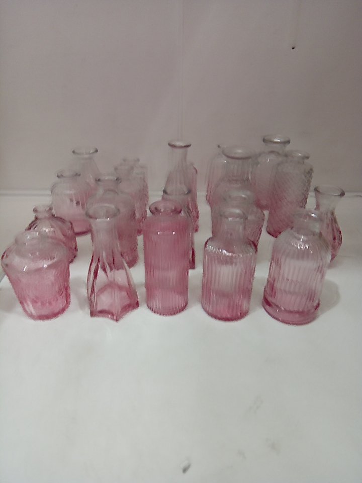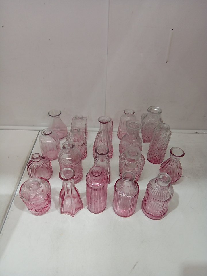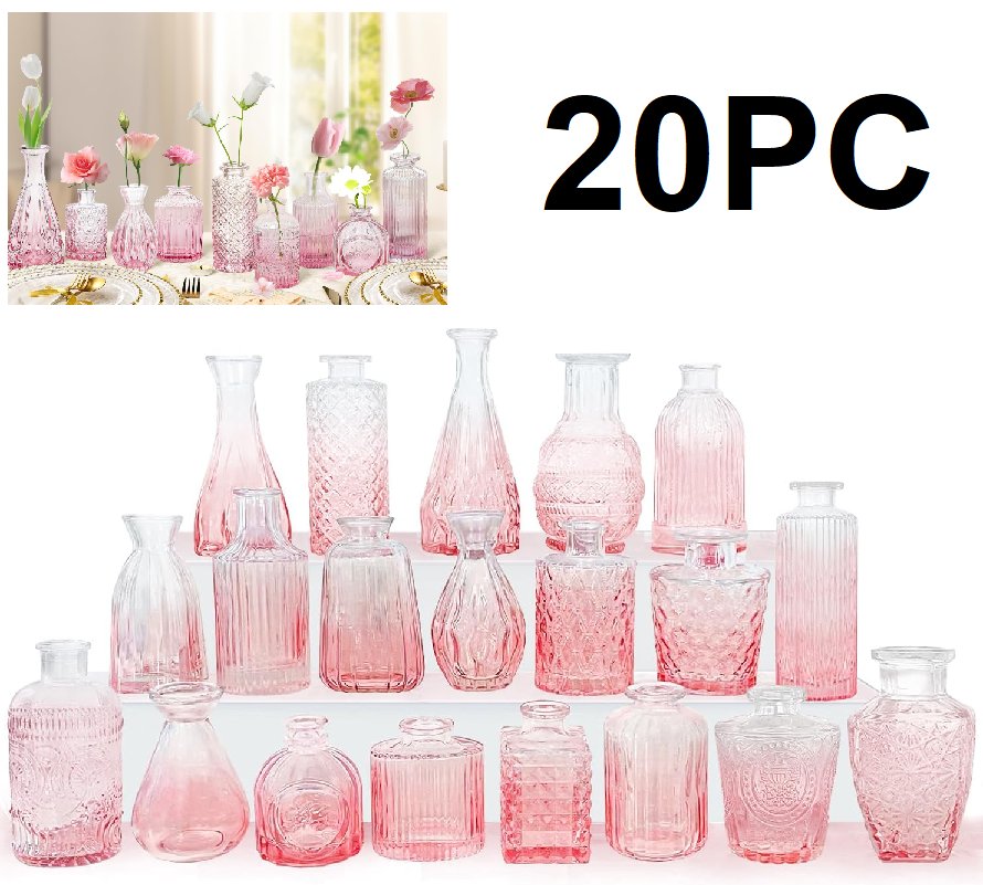 20PC QLOFEI PINK GLASS BUD VASES - MINI VINTAGE VASES FOR WEDDING DECORATION - HOME TABLE FLOWER DECOR - SMALL CARVED GLASS VASE CENTERPIECES