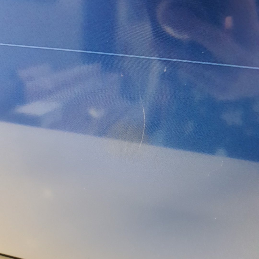 The screen has a cluster of dead pixel lines across the middle as well as a noticeable scratch. No stand included. See photos.