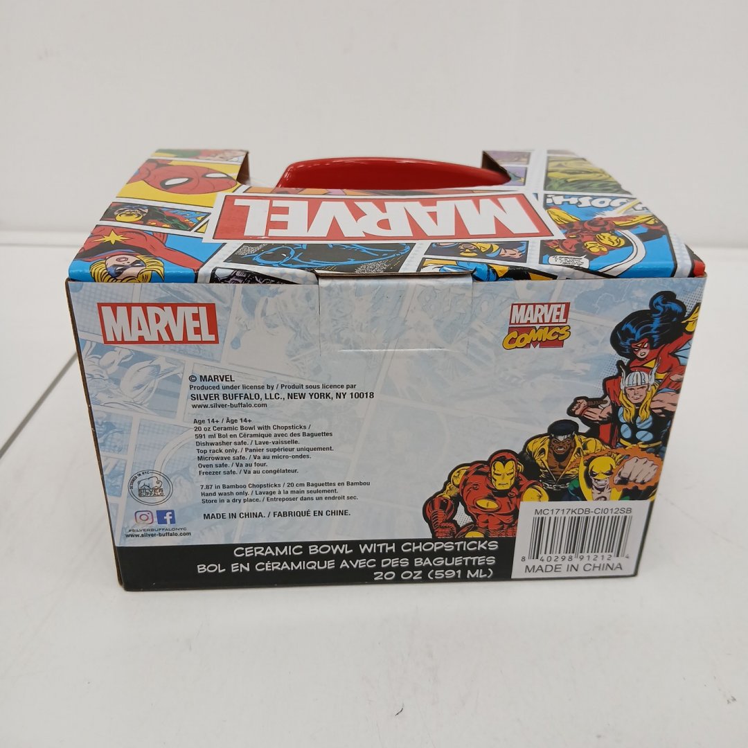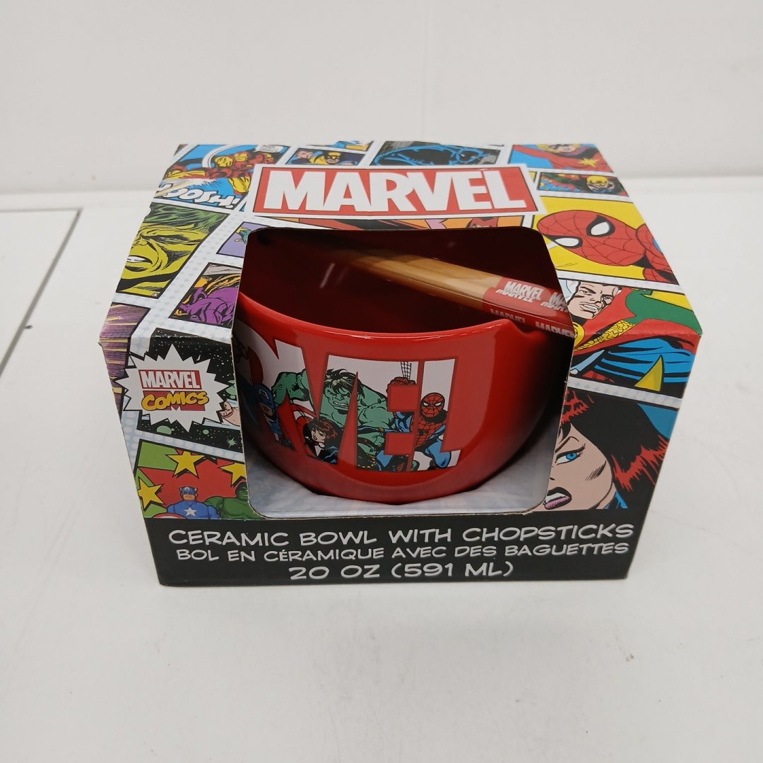MARVEL COMICS LICENSED CERAMIC RAMEN BOWL WITH CHOPSTICKS - 20 OZ (591ML) - RED, LOGO
