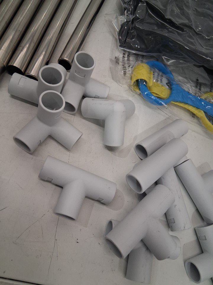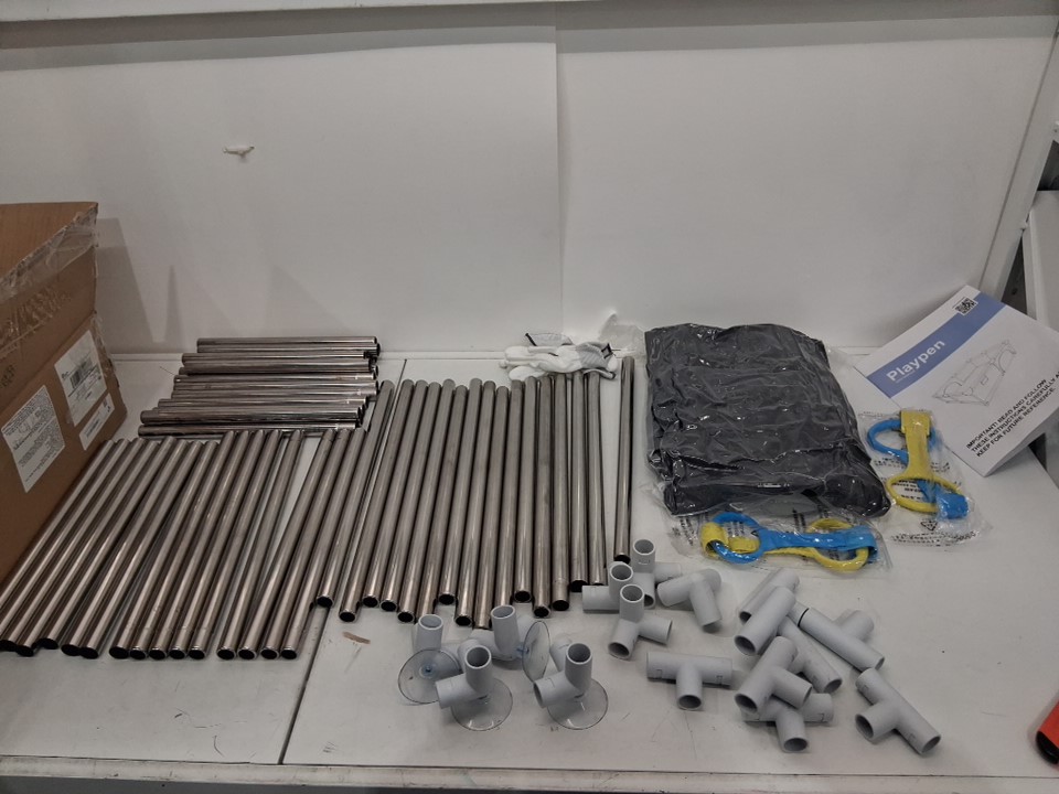 Stainless steel poles and connection ends have black scuff marks on them from rubbing together. Mesh piece is sealed Note: Poles are labeled differently than in instruction booklet