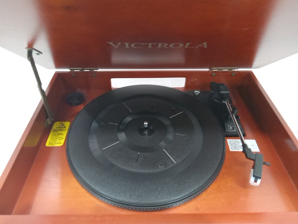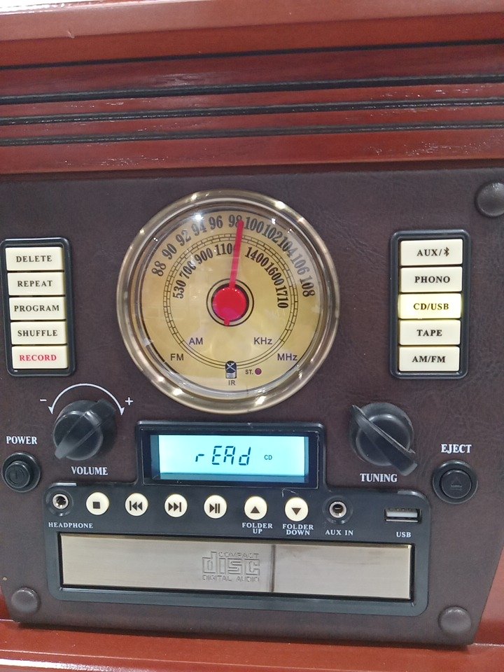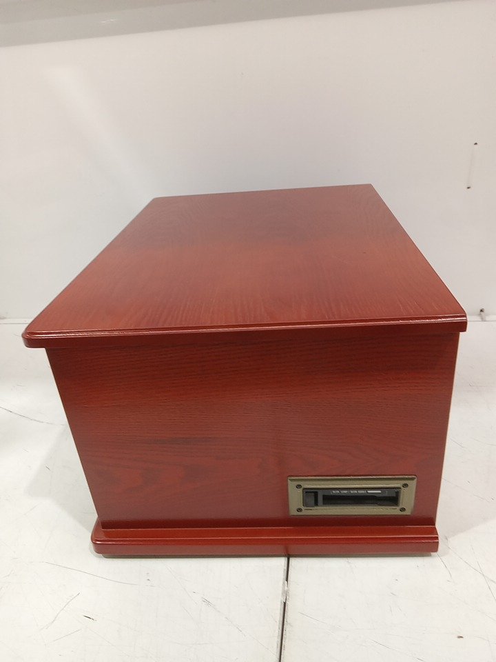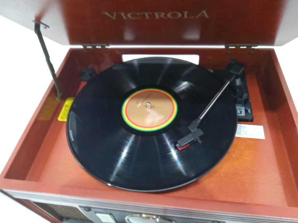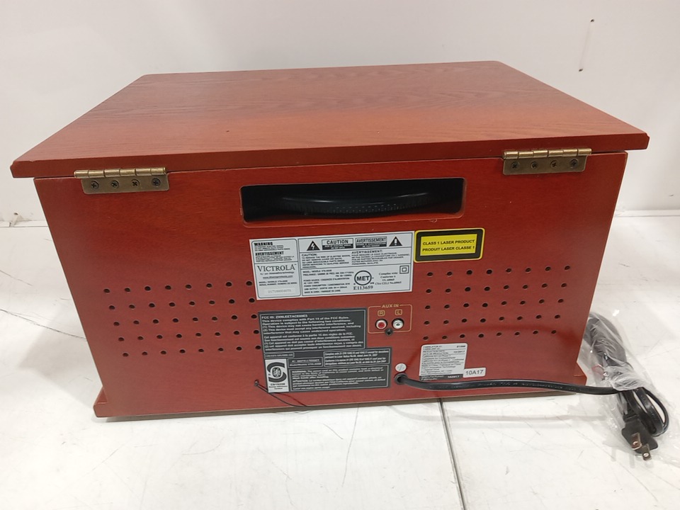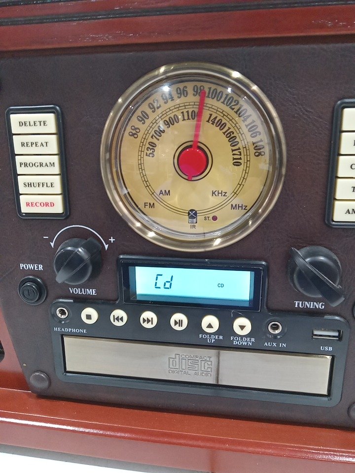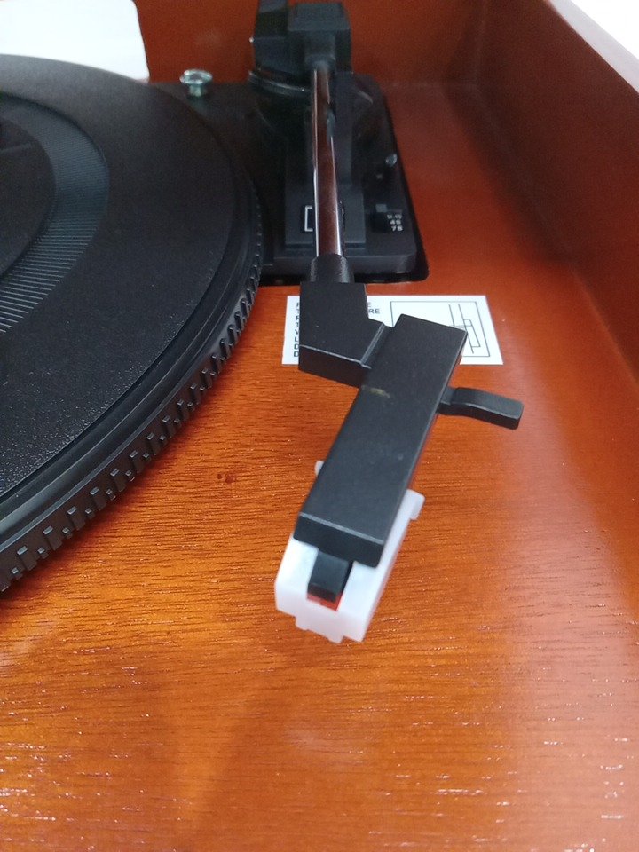 Please note that the the vinyl player turntable is loose but it still functions. There are minor scratch/scuff marks on the top due to shipping. Tested for power and functionality. (Please see photos)