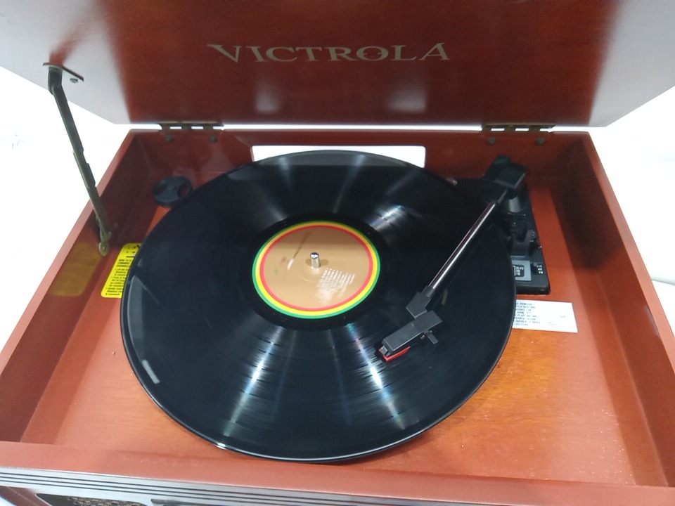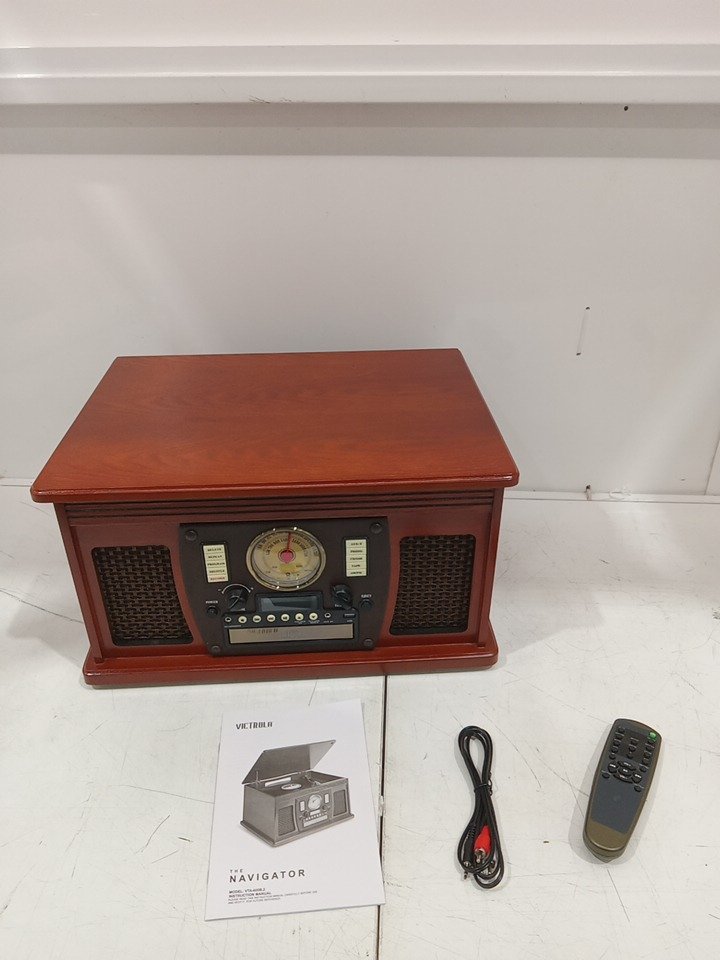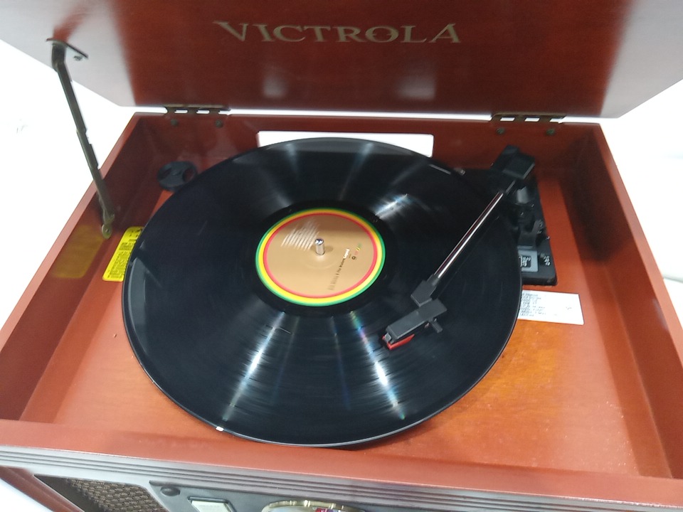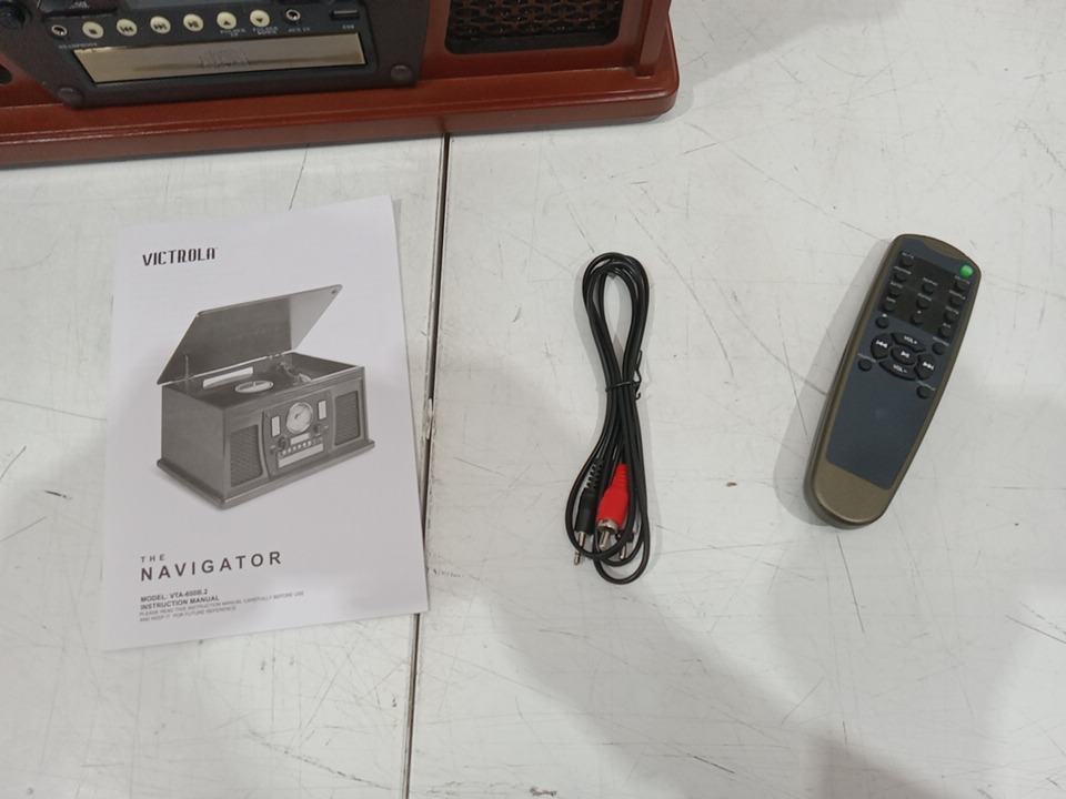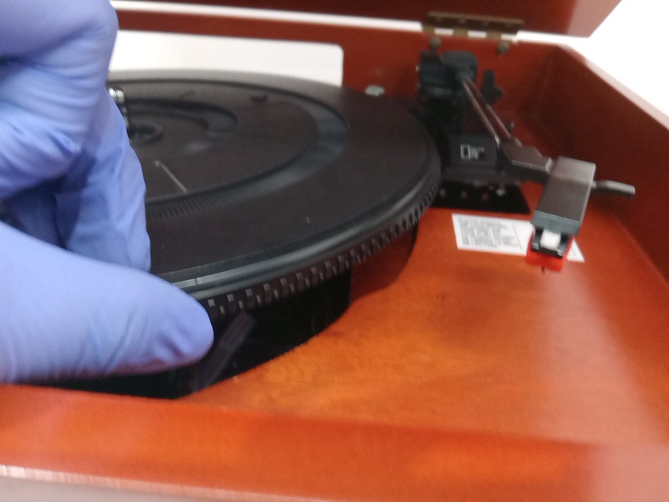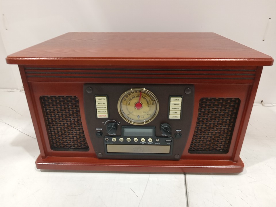Please note that the the vinyl player turntable is loose but it still functions. There are minor scratch/scuff marks on the top due to shipping. Tested for power and functionality. (Please see photos)