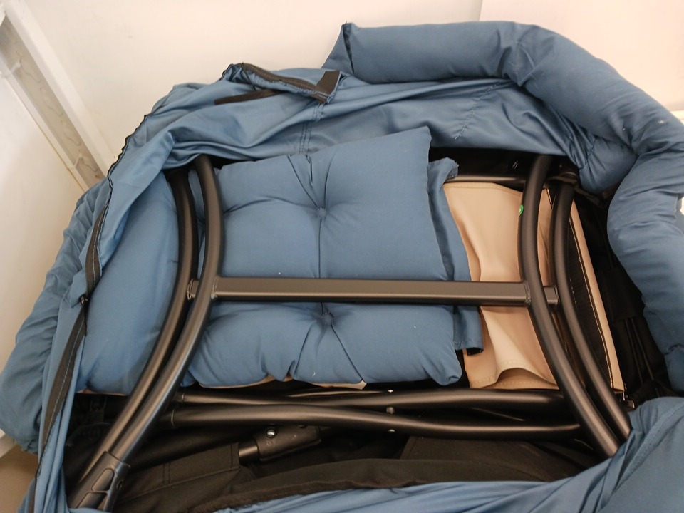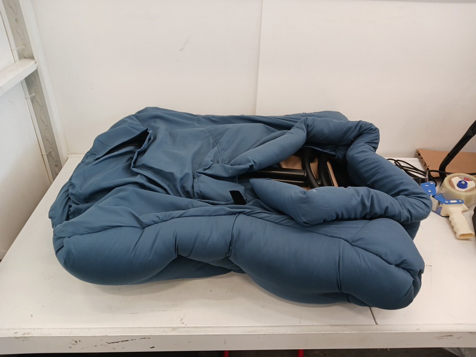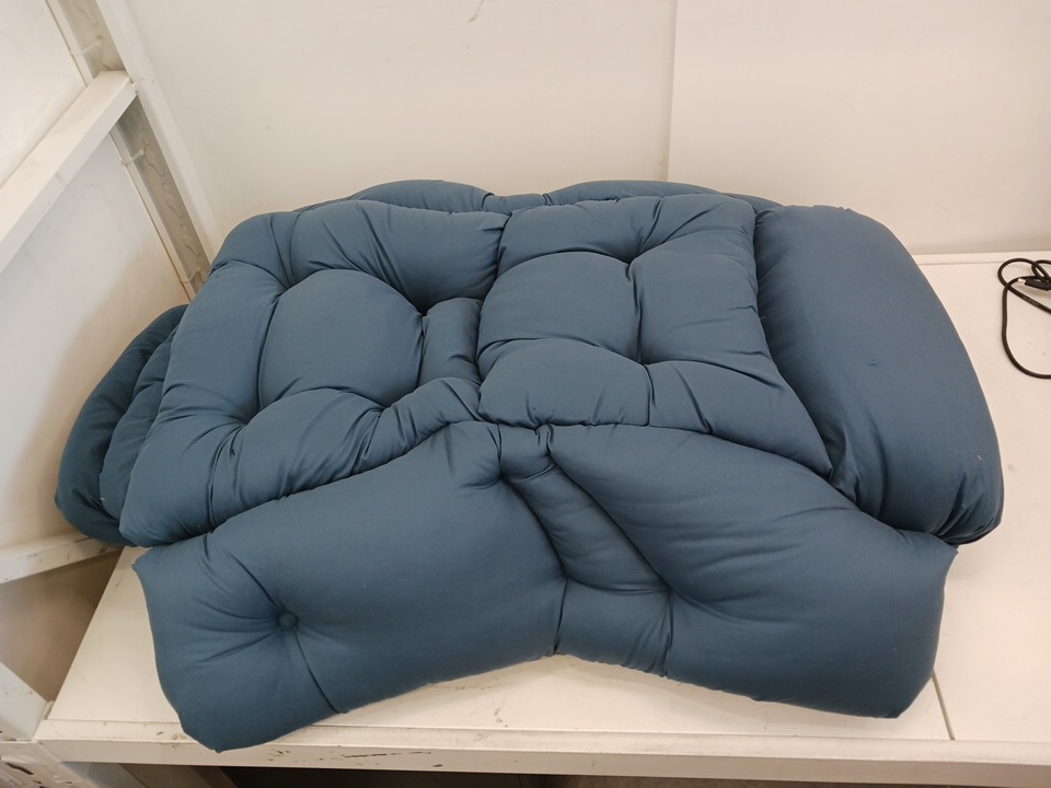 This chair with ottoman shows traces of pet fur on the fabric, indicating that it was previously used. The upholstery and cushion surfaces appear in overall good condition, with no visible tears, stains, or major damage. Light surface cleaning or vacuuming is recommended to remove remaining pet hair and restore the fabric’s appearance.
