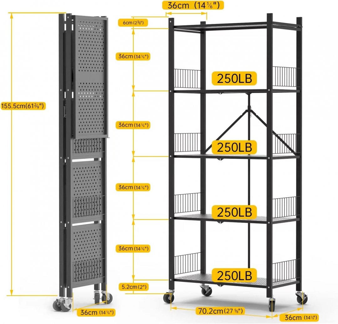 JAQ 5-TIER Foldable Storage Shelves WITH ROLLING WHEELS - 14.5" X 27" X 61" - BLACK (MODEL: GN200511)