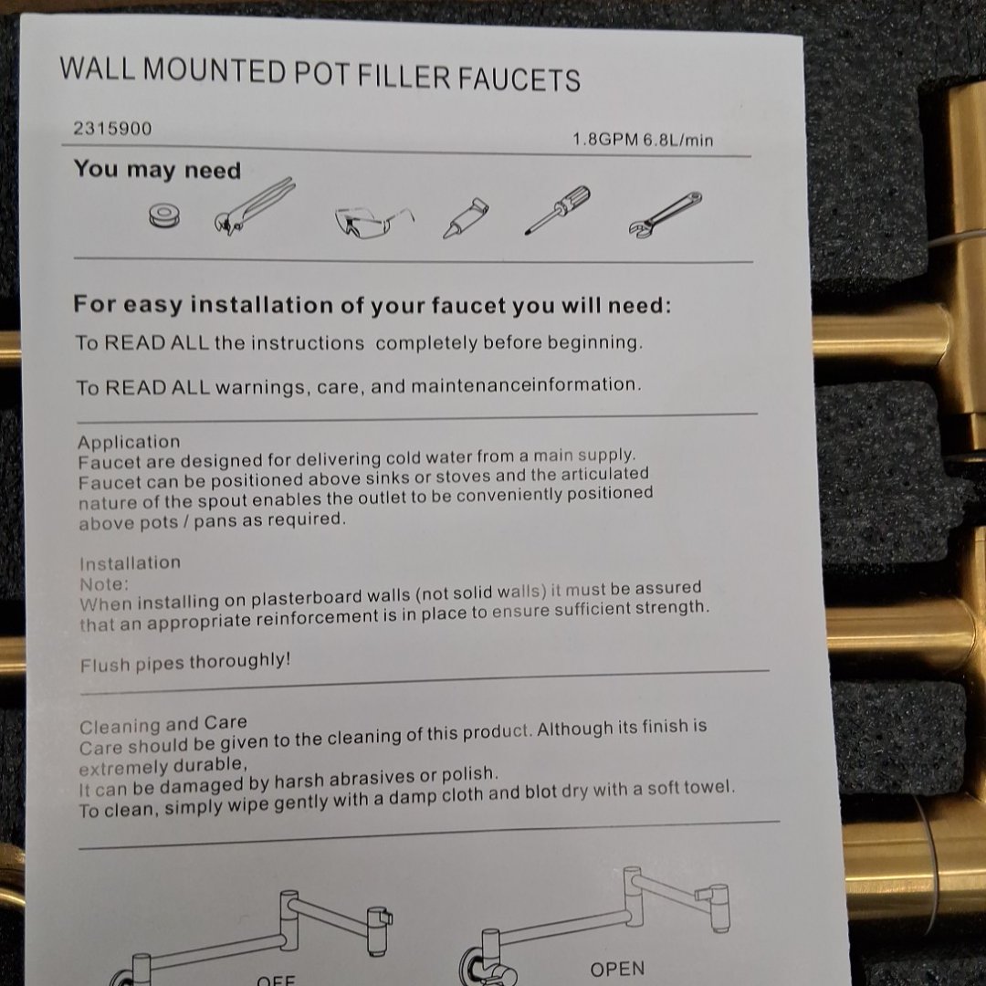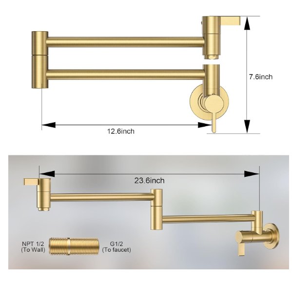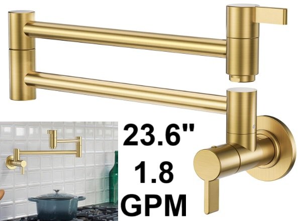 arcora wall mounted pot filler faucet with double joint swing arms - 23.6" - 1.8gpm - gold (model: ‎2315900G-US-B)