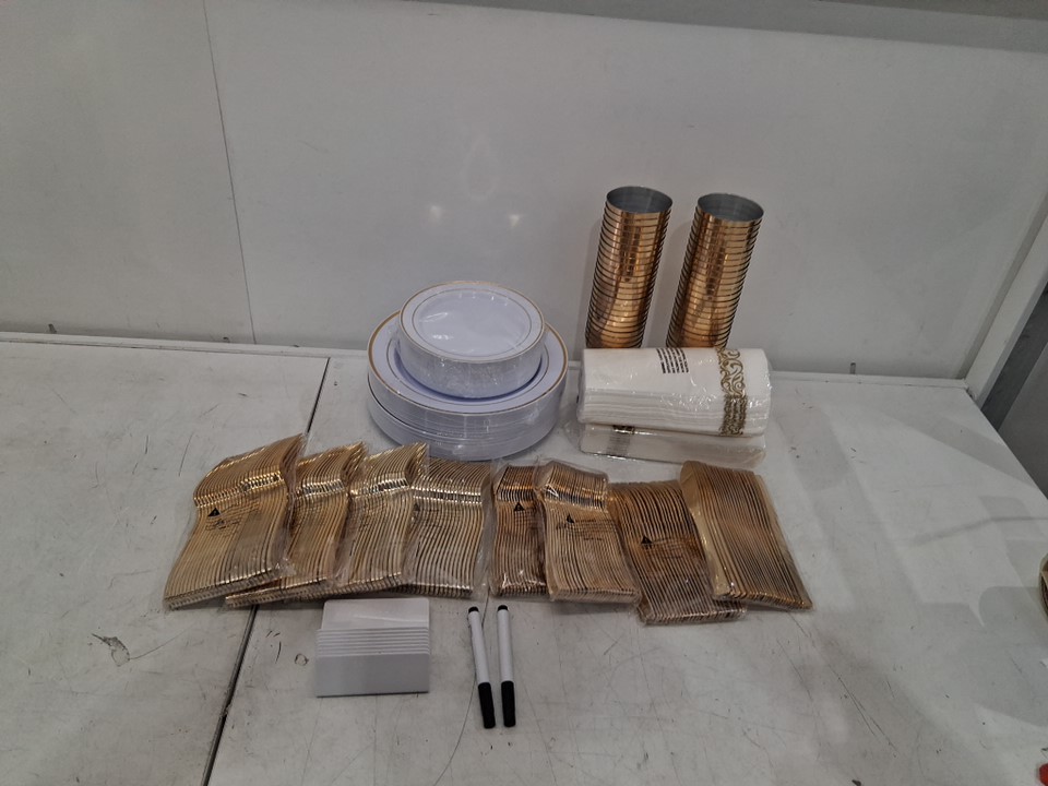 400PC PLASTIC DECORATIVE DINNERWARE SET FOR WEDDINGS AND EVENTS - GOLD/WHITE