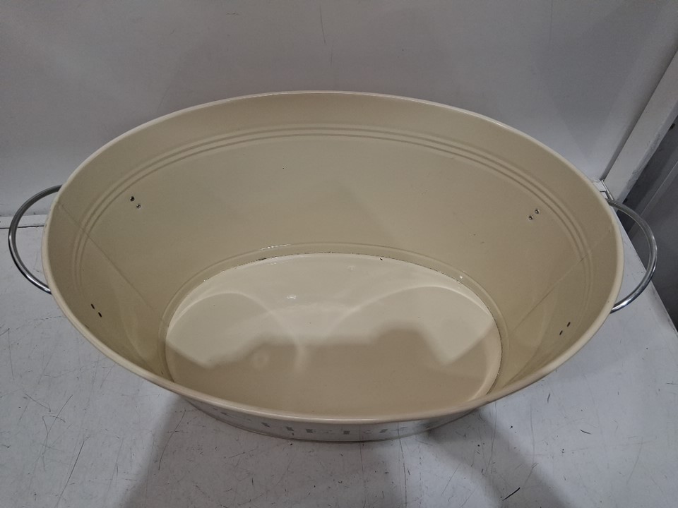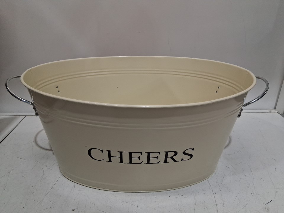 TWINE LIVING CO. GALVANIZED METAL TUB - PAINTED DECORATIVE "CHEERS" TIN WITH HANDLES FOR BEVERAGE STORAGE WITH ICE - BEIGE
