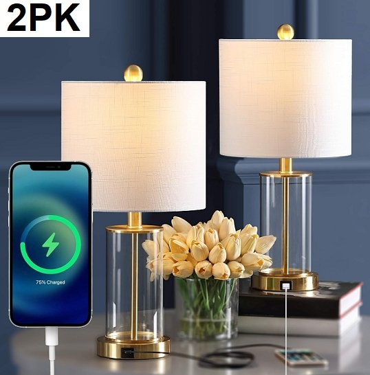2PK JONATHAN Y Abner 21" Glass Modern Contemporary USB Charging LED Table Lamp - GOLD/CLEAR - (MODEL: JYL8500B-SET2)