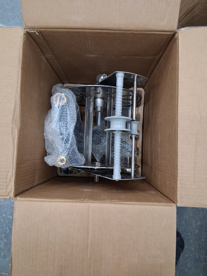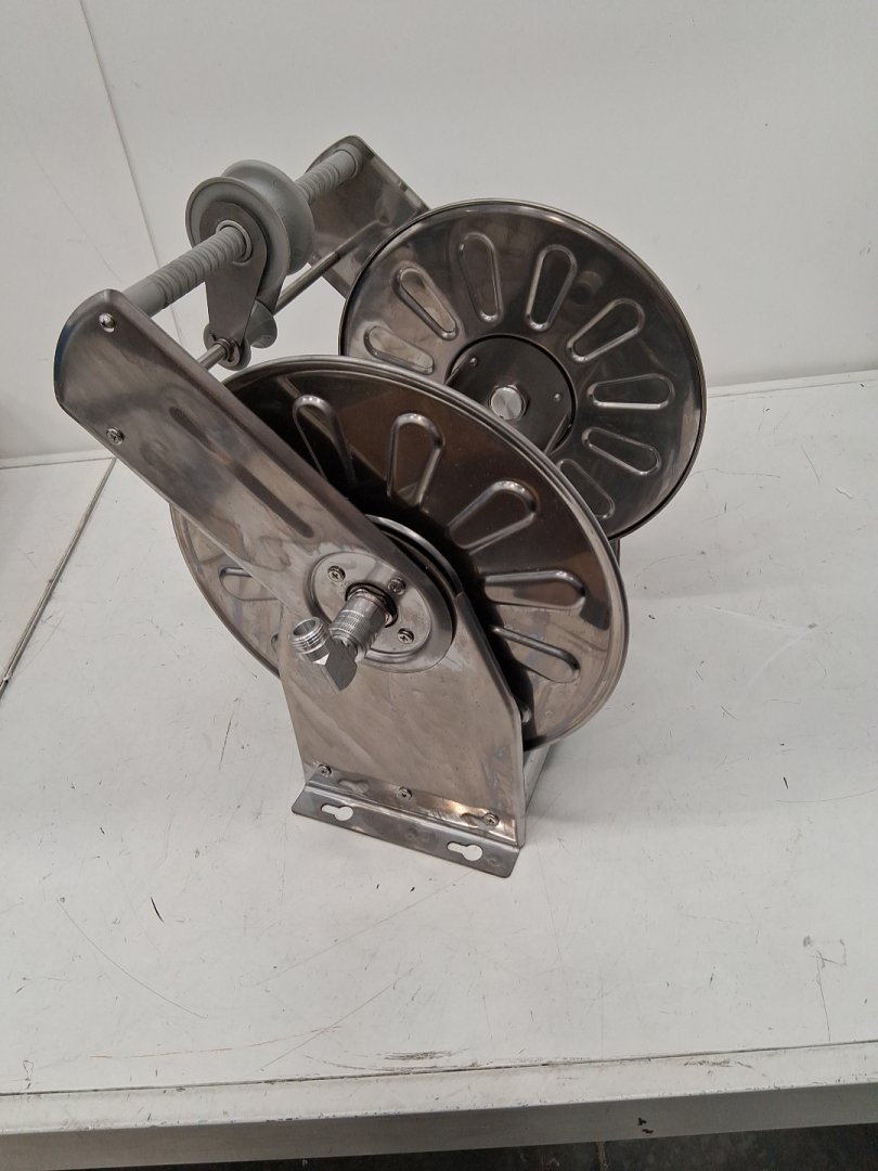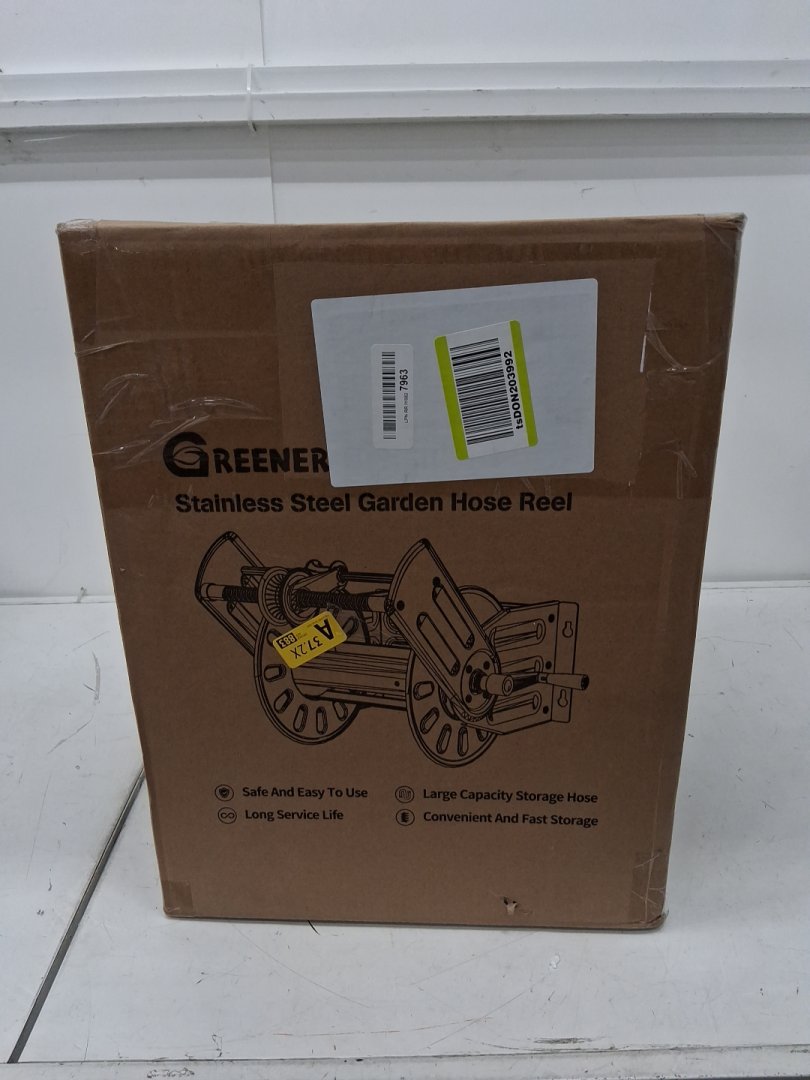 greener outdoor wall-mounted stainless steel garden hose reel with hand crank - 3/4" connector, 5/8" inlet hose (model: SS02)