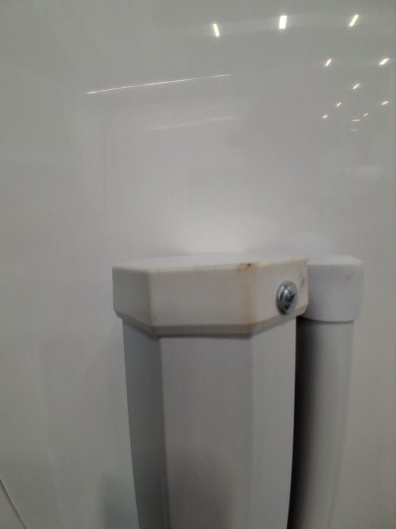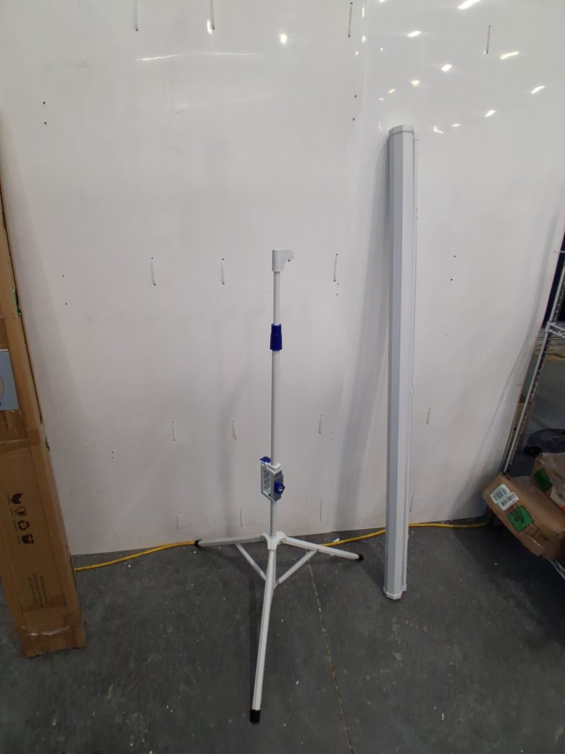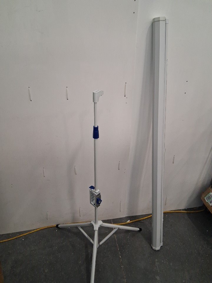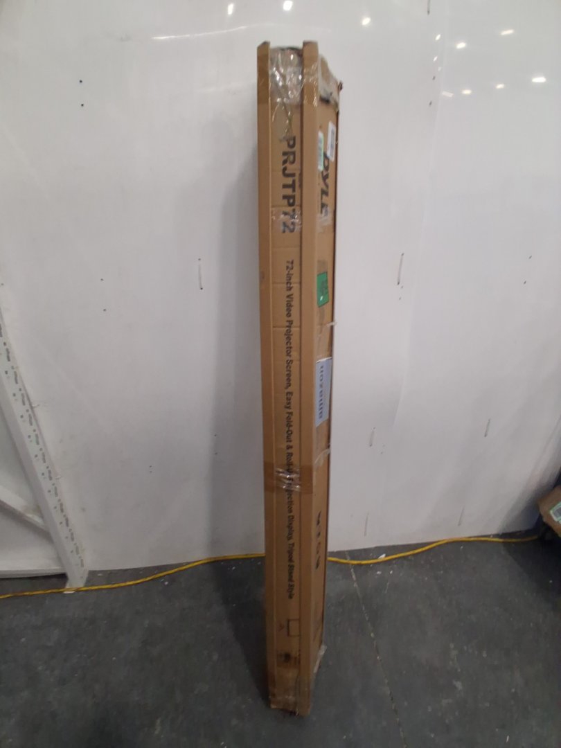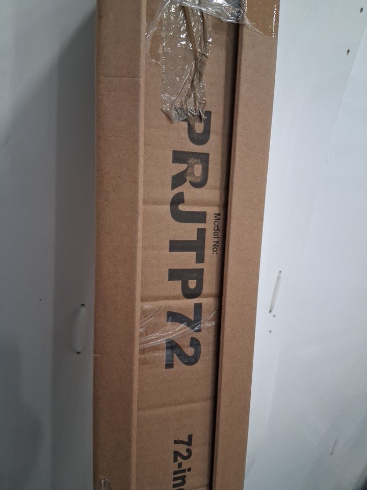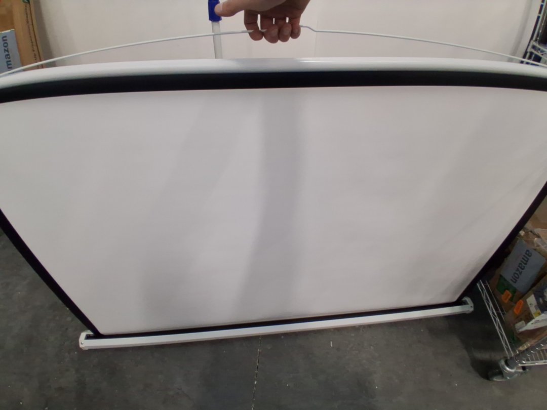 Scuffs and scratches on projector screen casing and tripod stand.