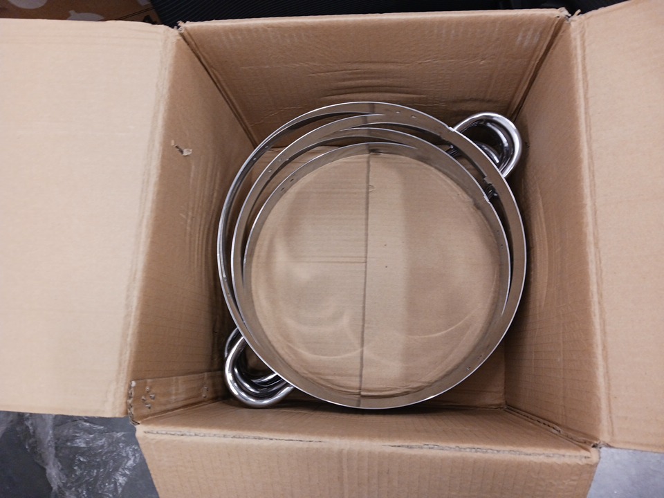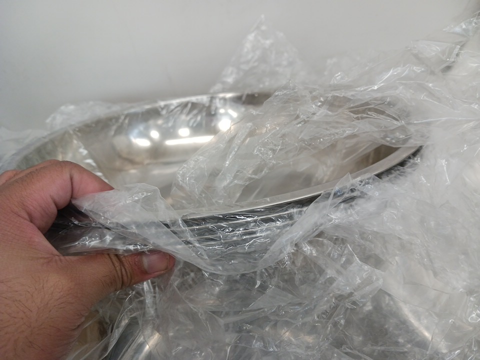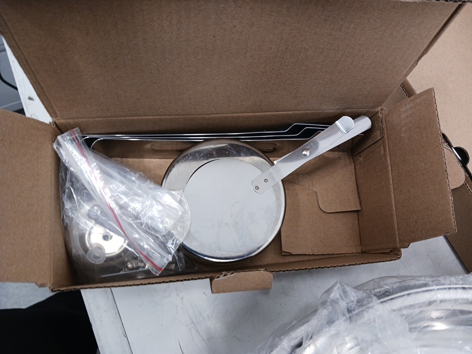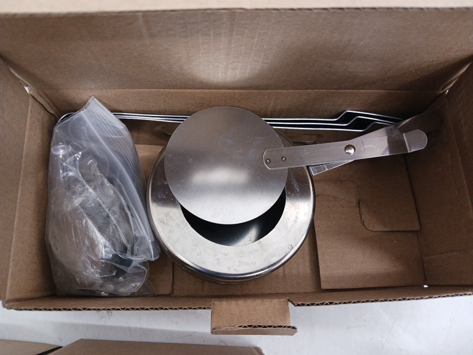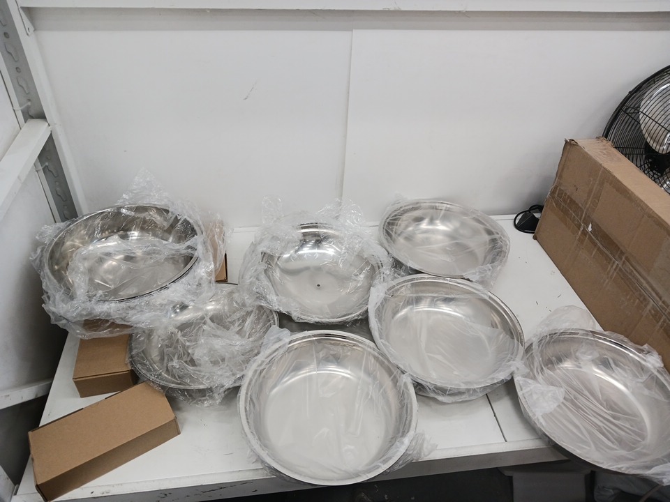 This chafing dish set shows some light residue and surface marks on the stainless steel components, suggesting that it may have been used previously. The residue appears to be from prior food contact or cleaning and can likely be removed with a thorough polish. All main components including the frames, pans, lids, and water trays are intact and structurally sound.