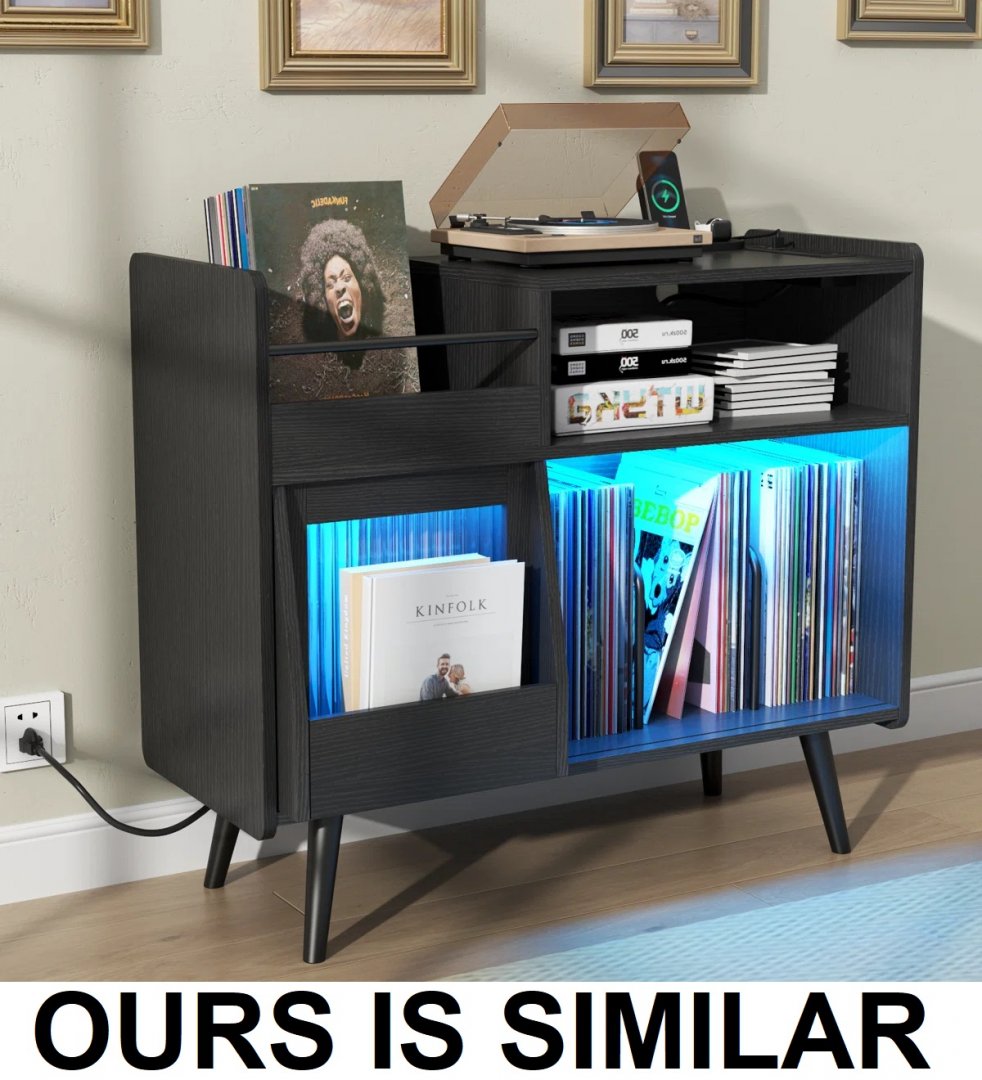 Large Record Player Stand 350 Vinyl Record Storage Holder with Power Outlet and LED Light - 34.25"X30.5"