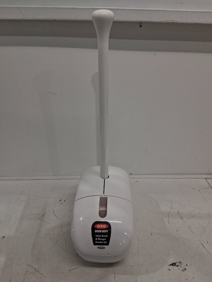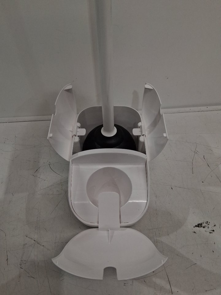 Please note the toilet brush is missing. The plunger and base appear unused with no water marks.