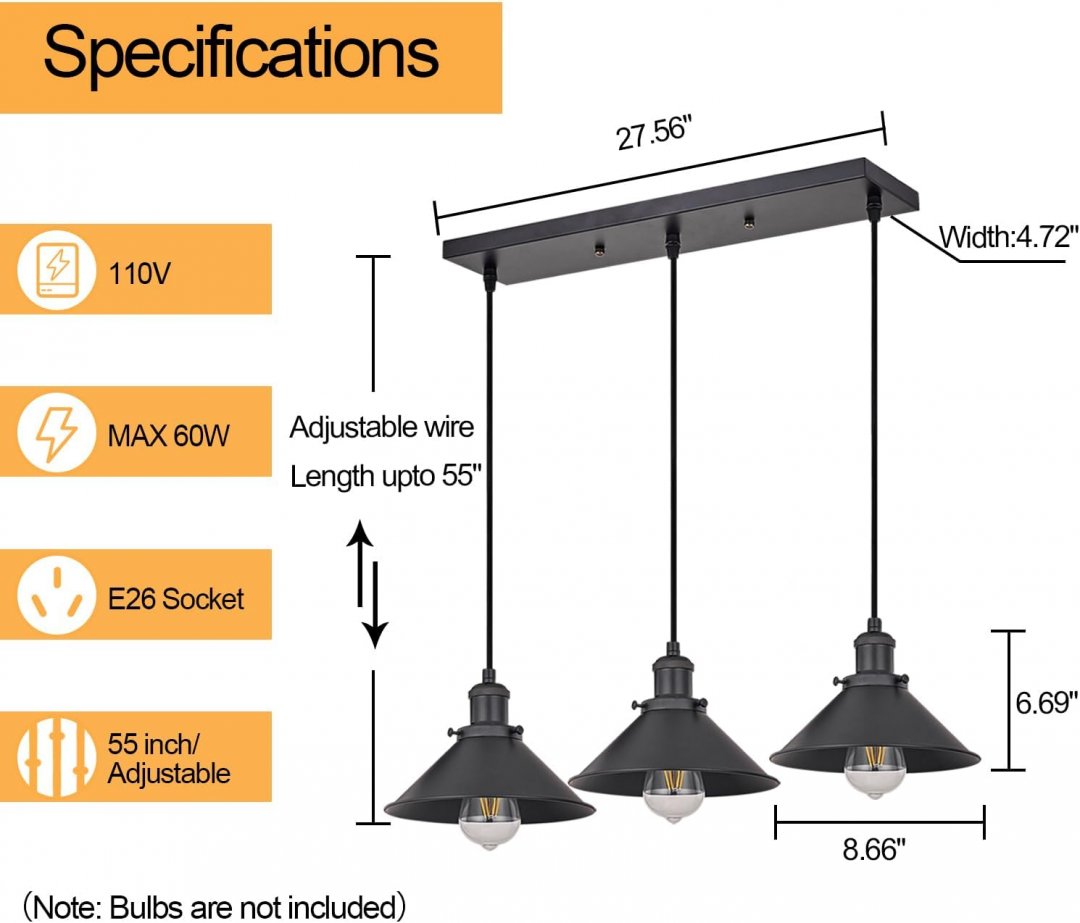 PASSICA DECOR 3-Light adjustable height Kitchen Island Pendant Lighting - 27.5" x 4.7" x 55" - black