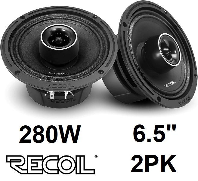2pk RECOIL MX65 2-Way Pro Audio Midrange Coaxial Speakers with Built-in Bullet Tweeters - 6.5", 560W Max (280W each), RMS @ 4-Ohm, Water Resistant, Grills Included - black (model: mx65)