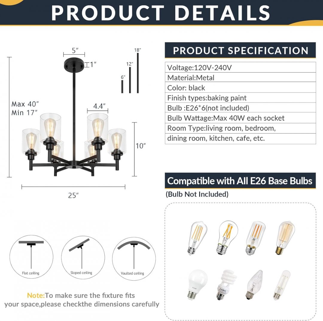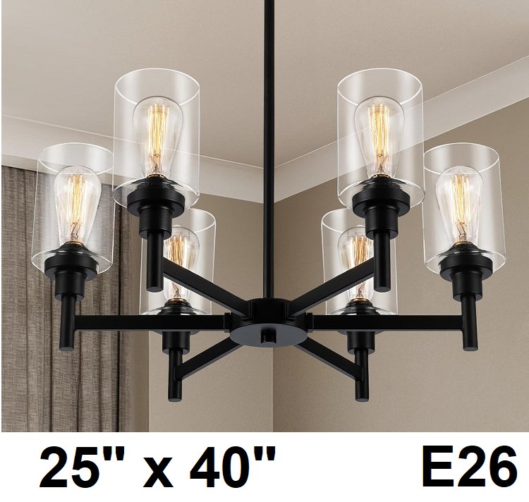LIGHTDAMY Farmhouse Chandelier 6 Light - E26 Bulb 25" x 40" - black
