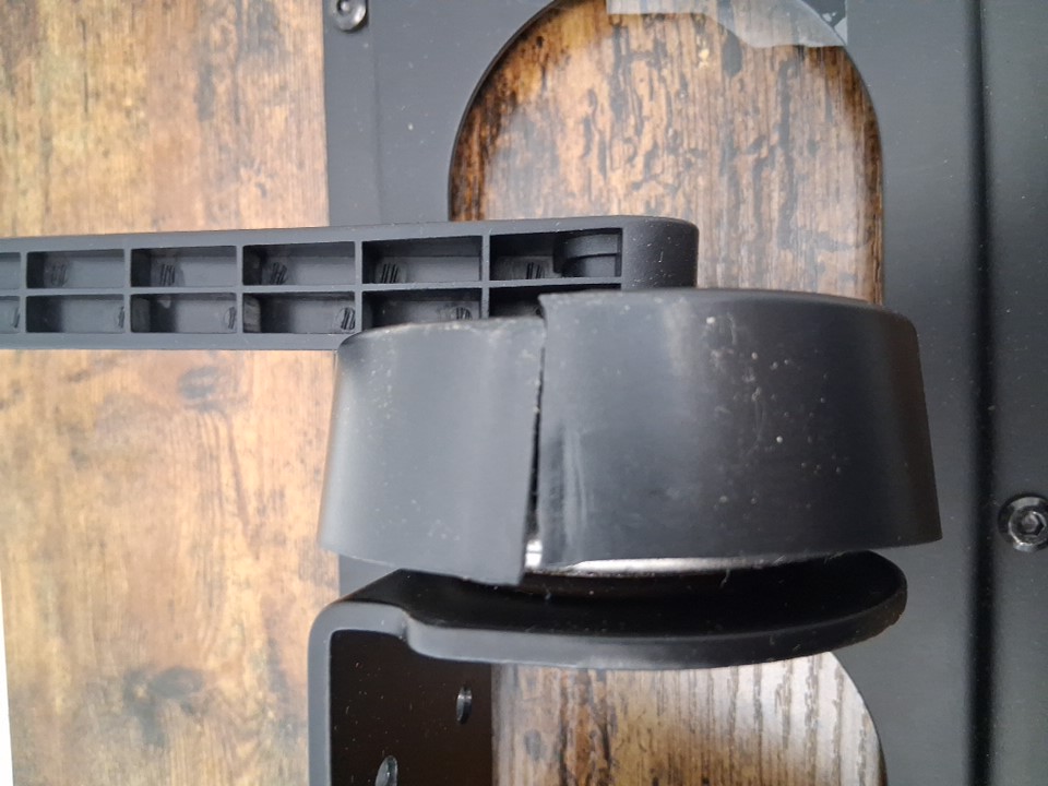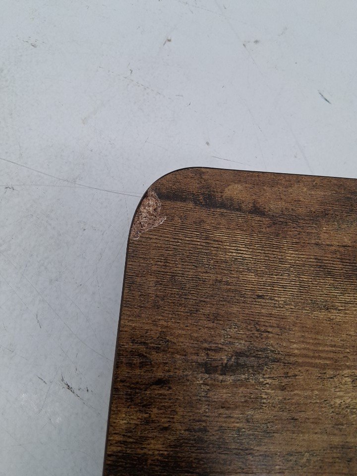 there is a small chip missing on the underside of the desk top as well as the plastic coverings on the bottom are split (photos will show)