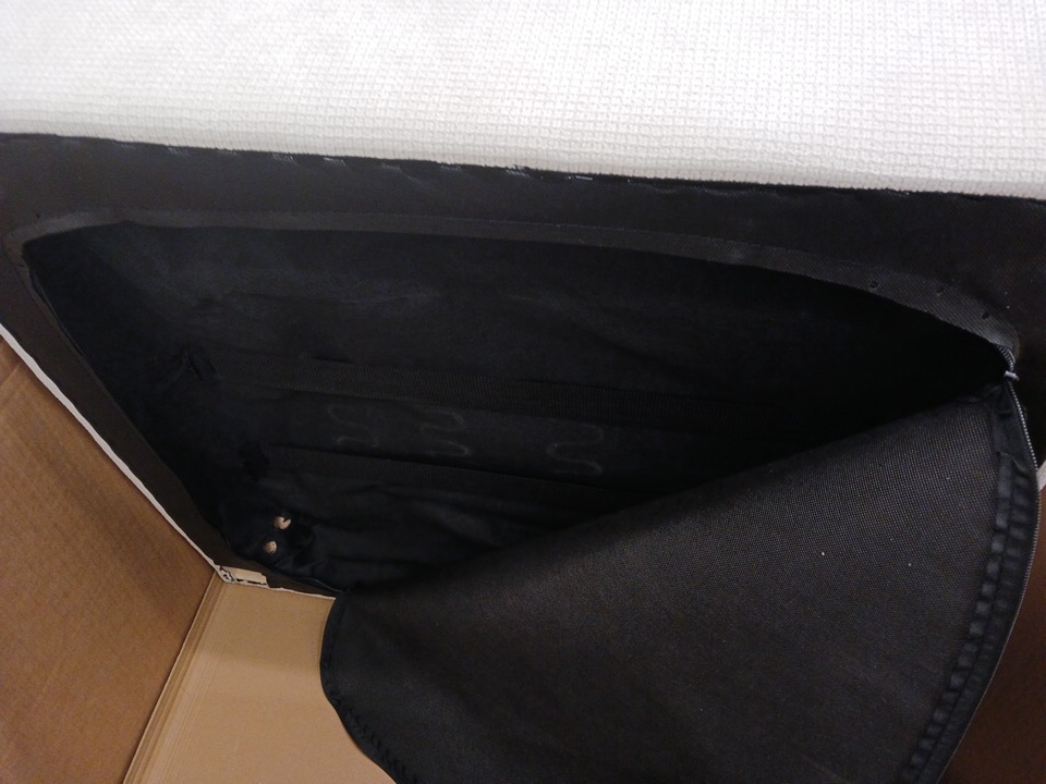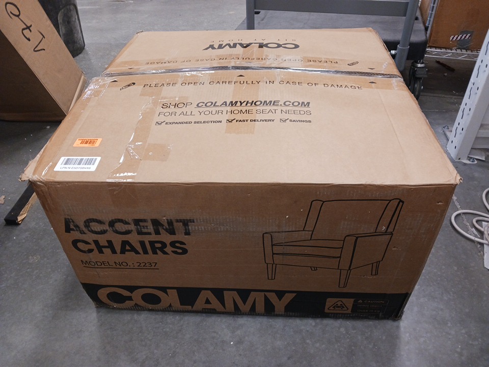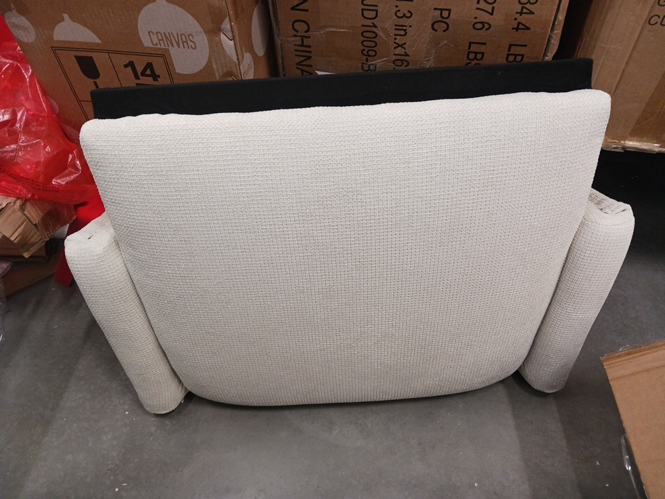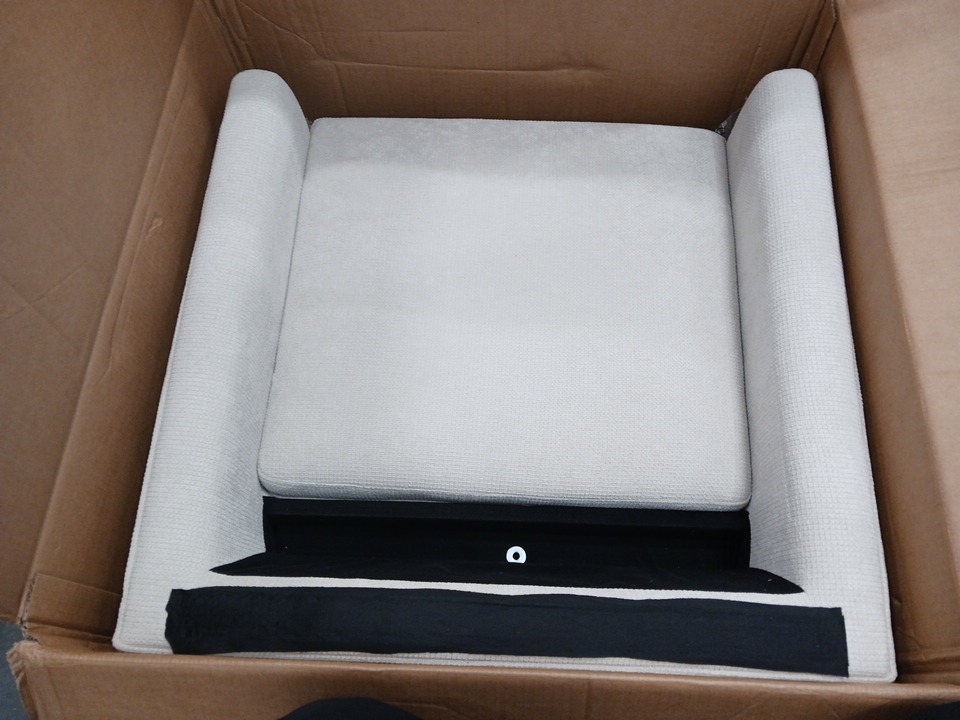 Legs are missing from the chair, but all other components are in good condition. The upholstery is clean with no major stains, tears, or damage, and the cushioning remains firm and supportive. Frame and fabric show minimal signs of use.
