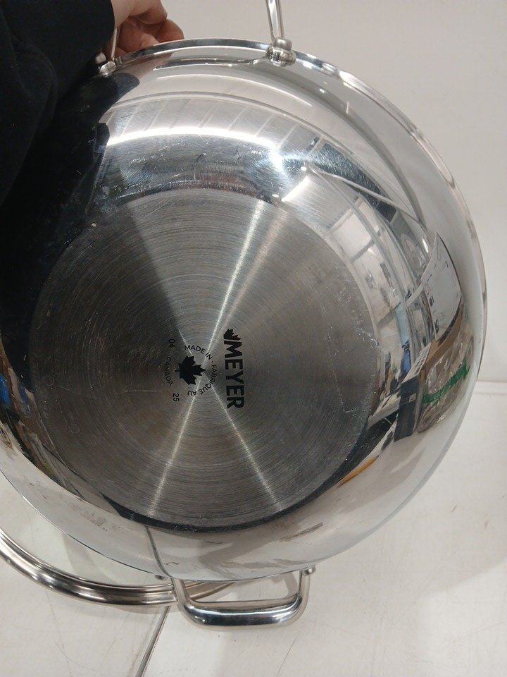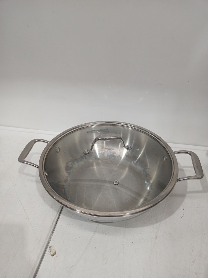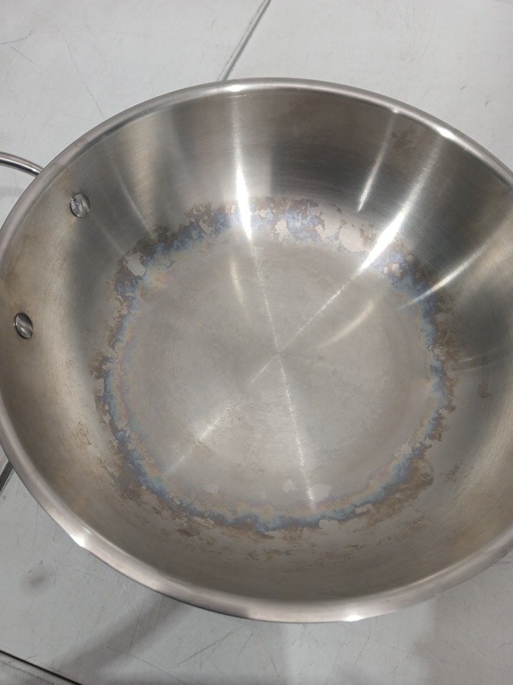 Has some marking on the bottom and inside of pot from use. There is some tape/sticker residue from being taped shut in returning it and shipping label.