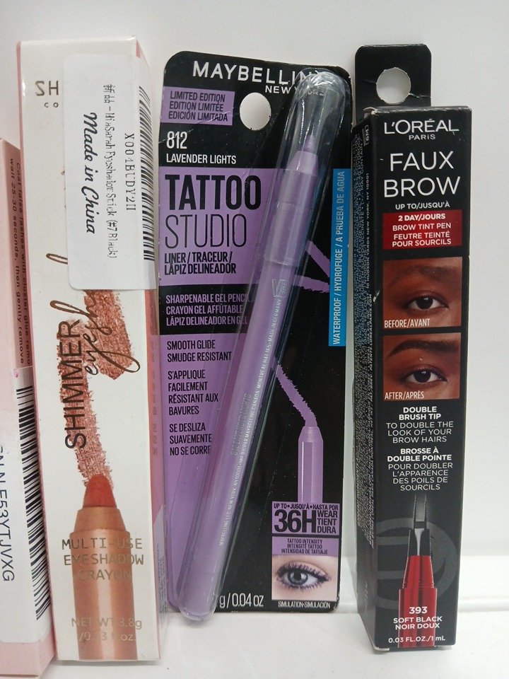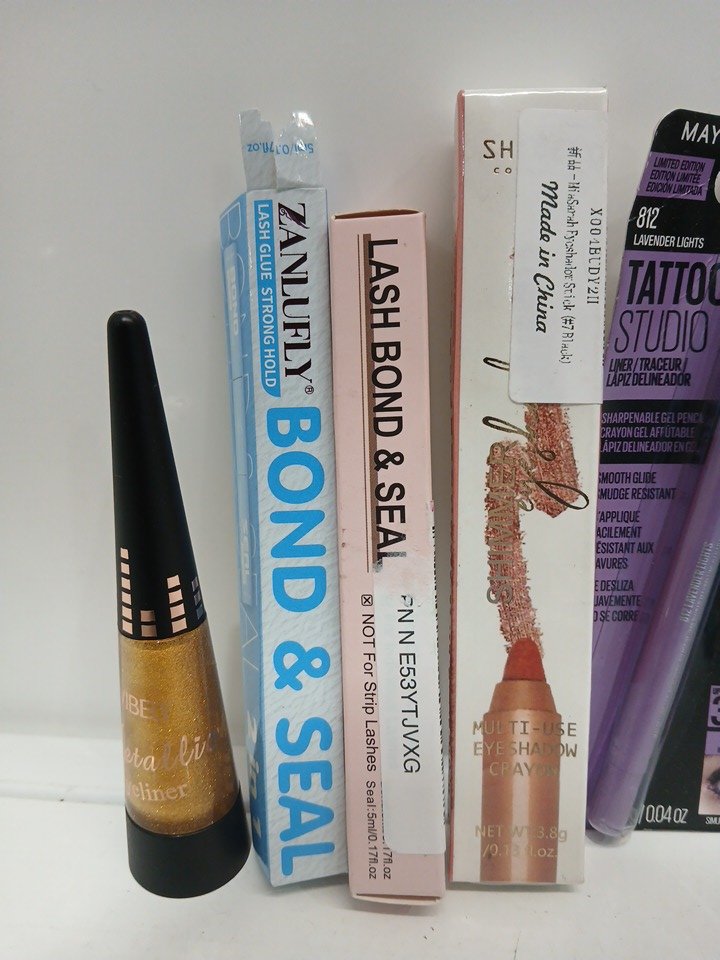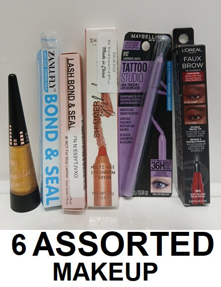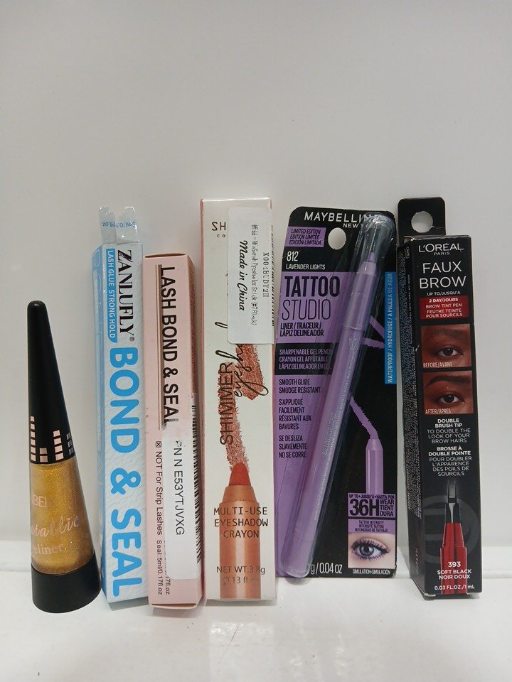 6 ASSORTED MAKEUP - ASSORTED BRANDS - eye liner/lash glue/eyeshadow/brow tint