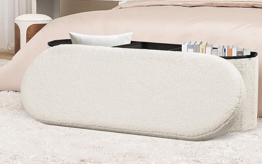 PINPLUS Storage Ottoman Bench Tufted Oval Ottoman Bench Foot Rest, Chest Box Velvet Bench with Storage - 43" x 15" x 15" - white (Model: b2c-xyf240091BE-white)