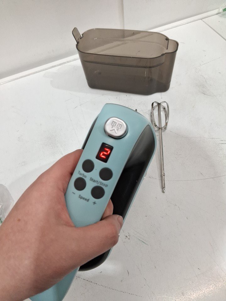 item has light flour/food residue on the bottom of the main item, item was tested for power to full speed