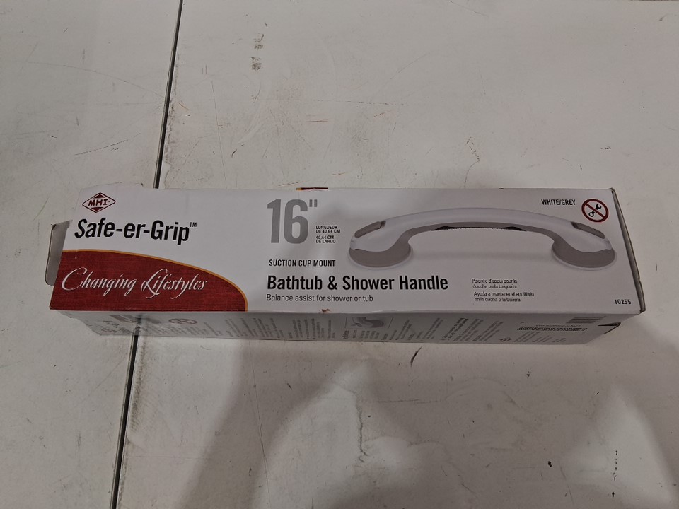 MHI SAFE-ER-GRIP changing lifestyles SUCTION CUP MOUNT BATHROOM/SHOWER HANDLE - 16" - WHITE/GREY (MODEL: 10255)