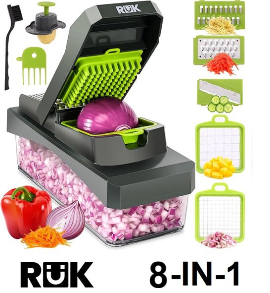 RüK 8-in-1 6-Blade Vegetable Chopper with 1.5l Container - GREY/GREEN (‎RY-EVC01)
