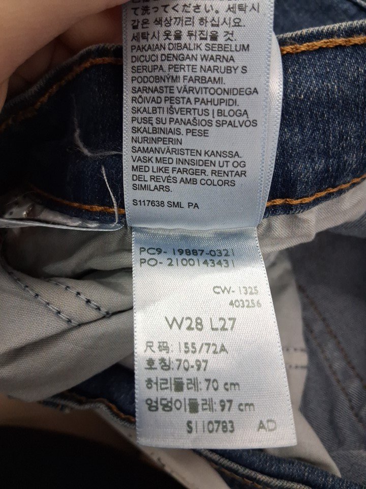 Tags on jeans are light blue from previous washing