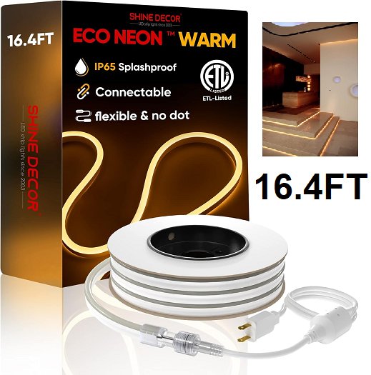 Shine Decor LED Rope Lights AC 120V, Connectable & Cuttable Dotless 120LEDs/M Eco Neon Strip Lighting, ETL IP65 Waterproof & Weather-Resistant for Home Commercial, 8x16mm, 2600K - 16.4FT - Warm White