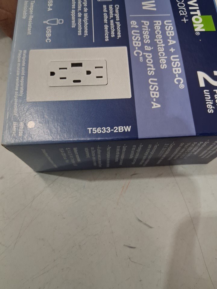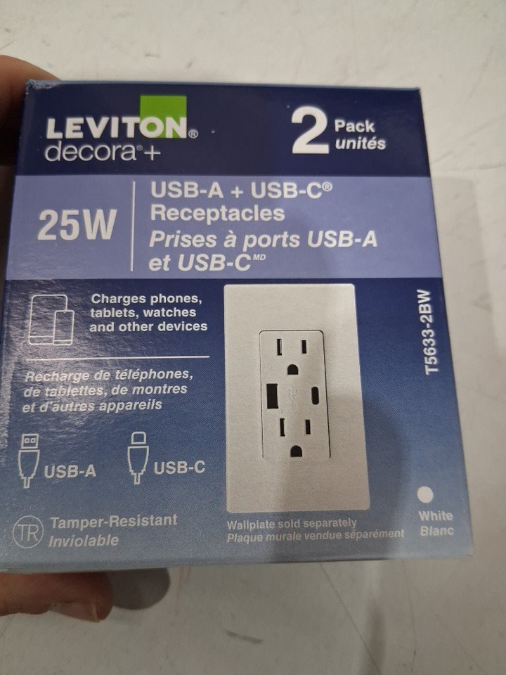 2PK Leviton Decora USB in wall receptacles 5.1A Type A/Type-C 15A Receptacle - White - (MODEL:T5633-2BW)