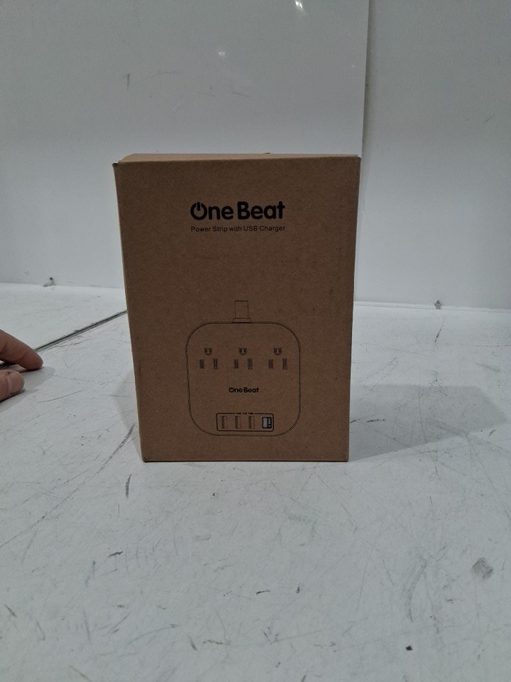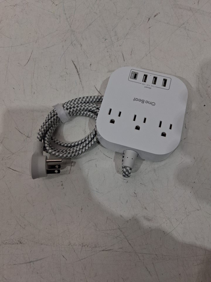 one Beat Power Bar Power Strip with a Flat Plug and Braided Extension Cord - 3 Outlets 3 USB, 1 usb-c Port - 5ft - white/grey (MODEL: ‎THU6106A)