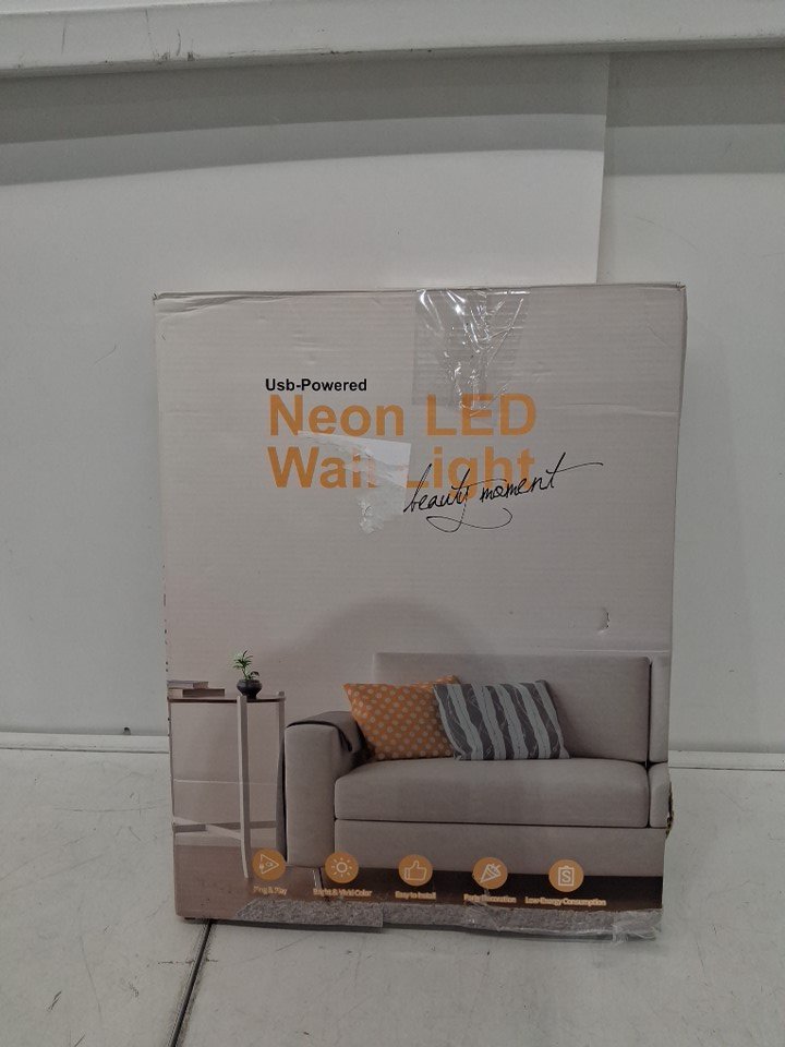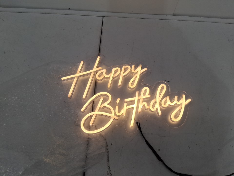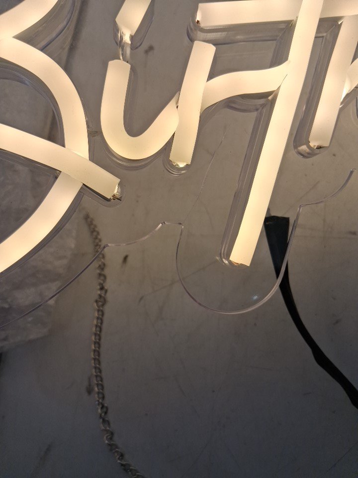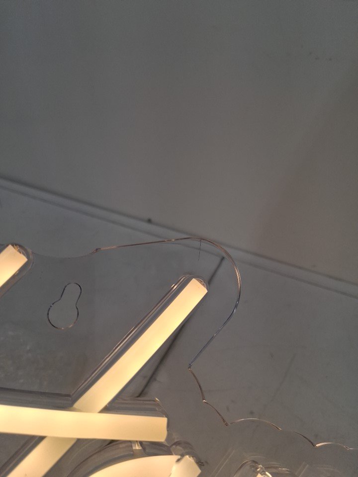 Neon sign has two cracks in acrylic; a small crack at top by "h" and a larger crack under "r"