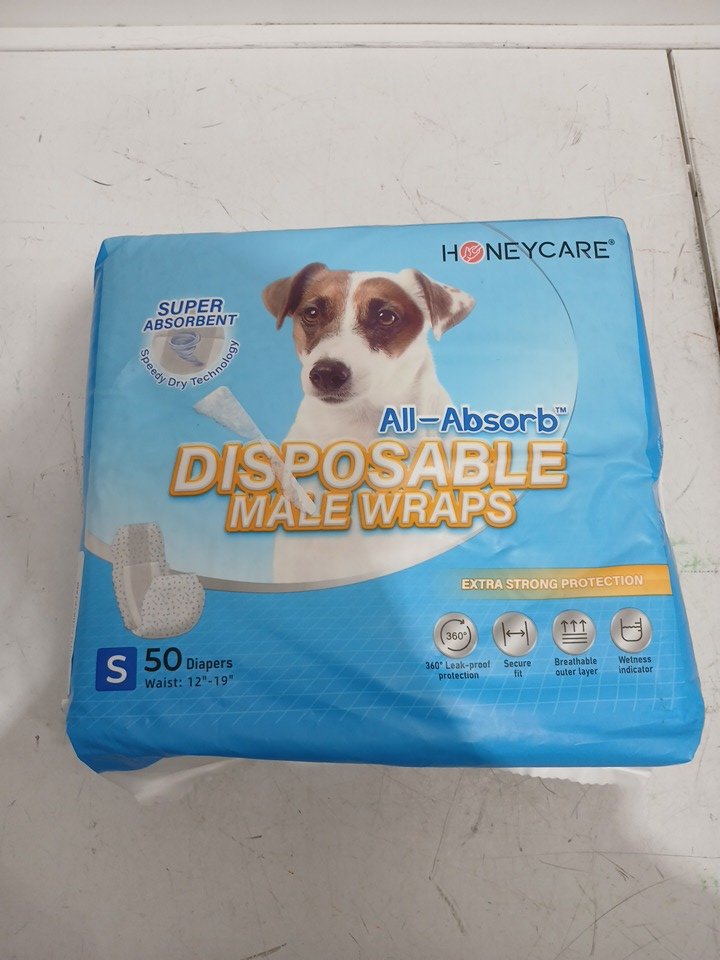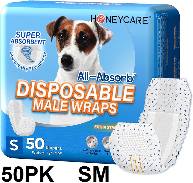 50PK HONEYCARE ALL-ABSORB DISPOSABLE MALE DOG DIAPERS - SMALL (12"-19" WAIST)