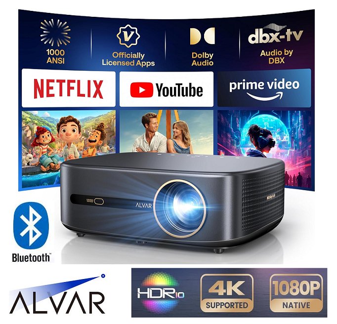 Alvar v800p Netflix Licensed Projector with native 1080p, 4K support, 30W Speakers, DoIby Audio, WiFi 6 & Bluetooth - Black (model: c201)