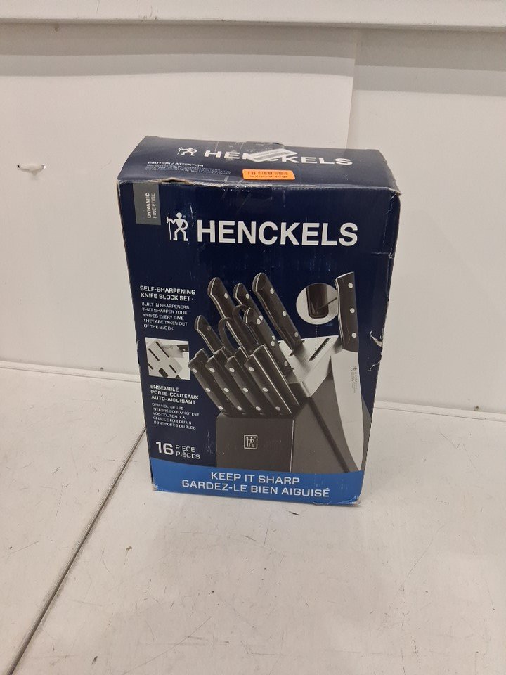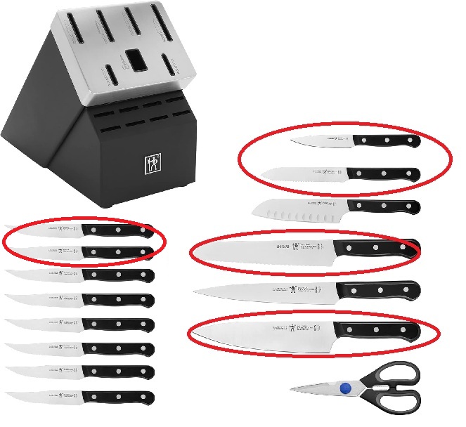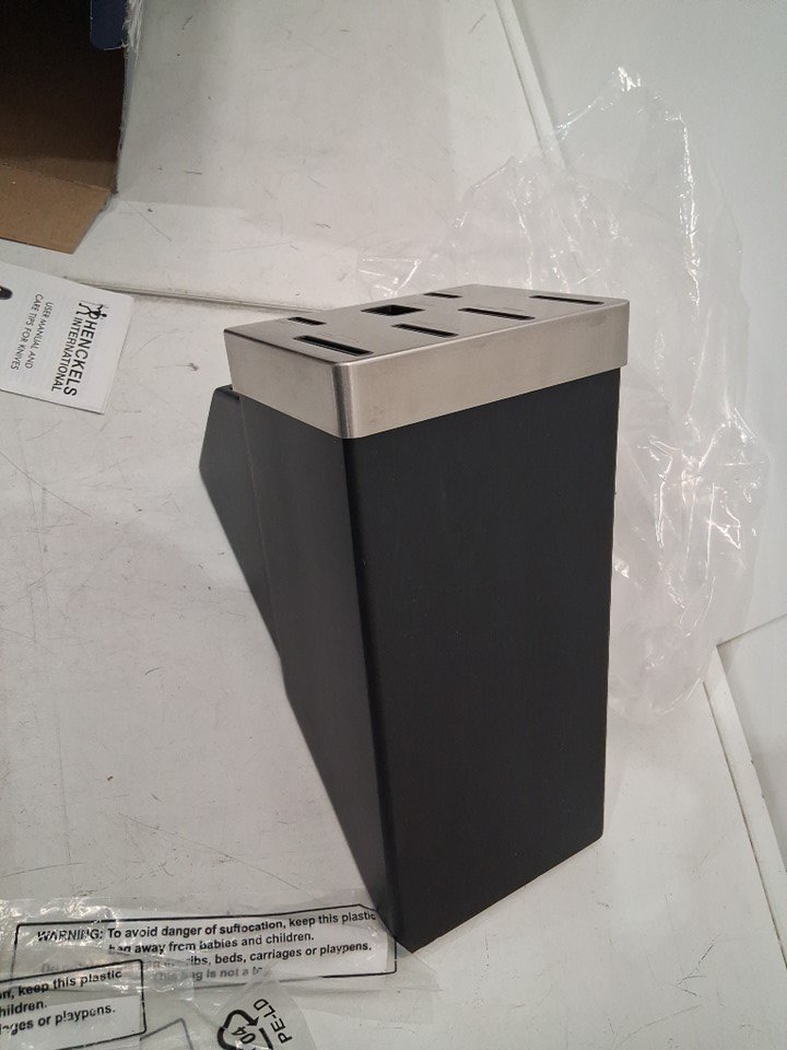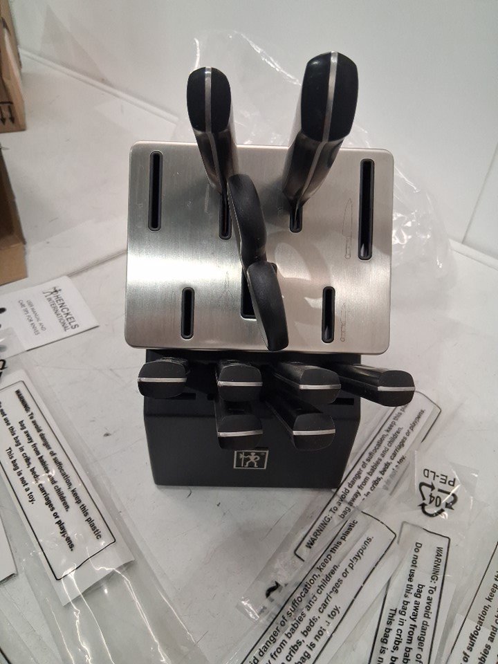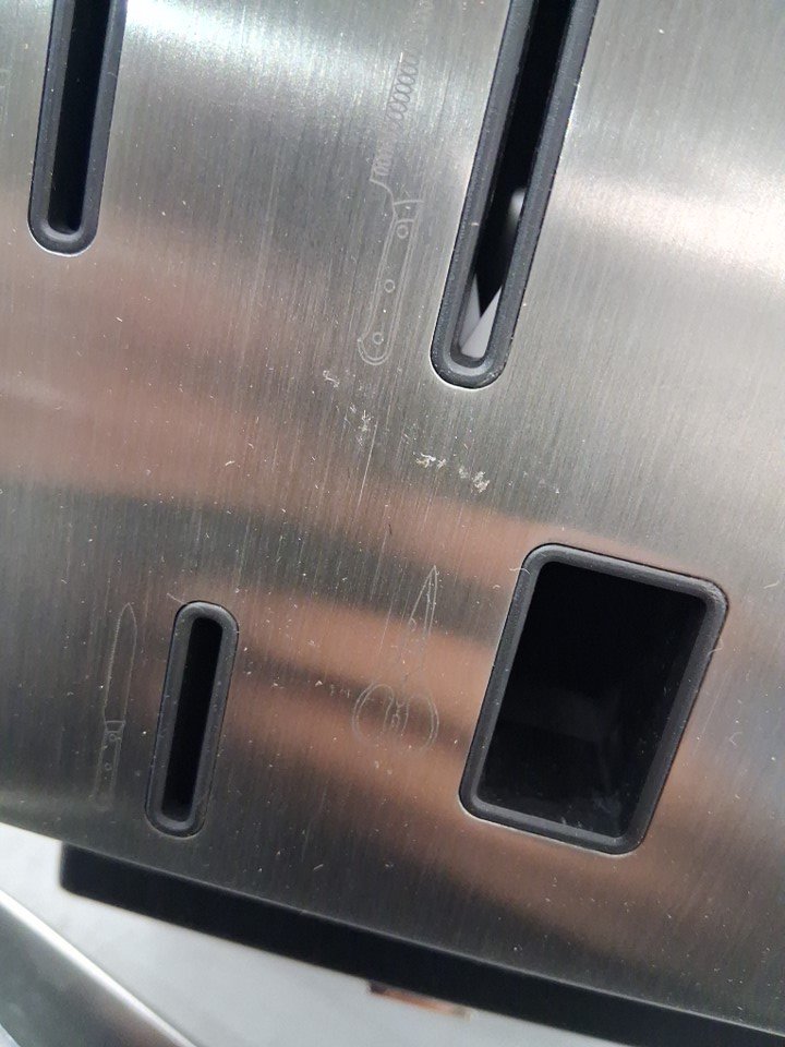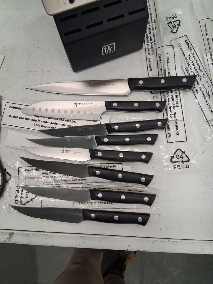 Knife set is missing 6 knives; Paring knife, serrated utility knife, serrated bread knife, chef's knife, and 2 steak knives. Knife block has scratches on it