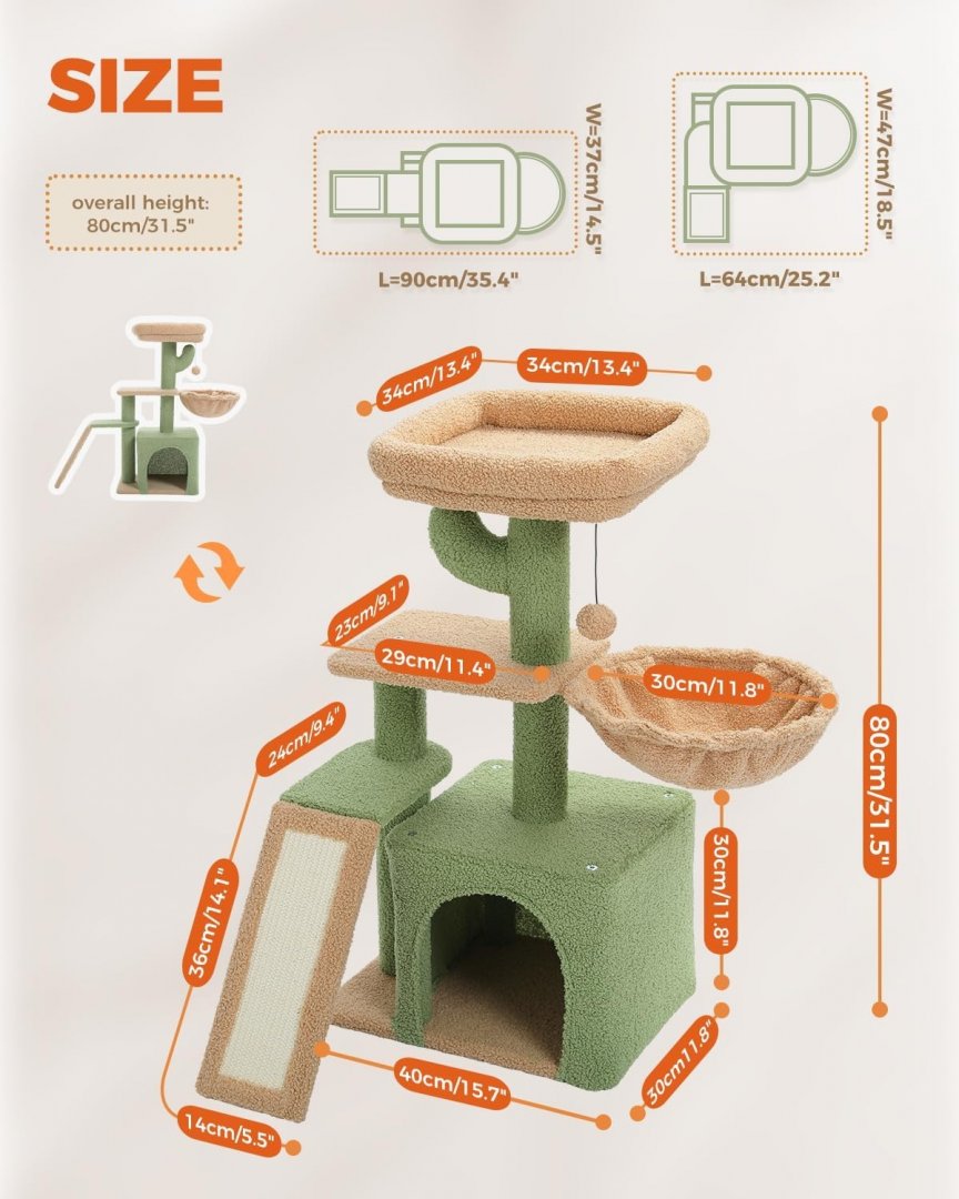 PAWZ Road Cactus Cat Tree for Indoor Cats with Sisal Scratching Ramp Green - 31.5''