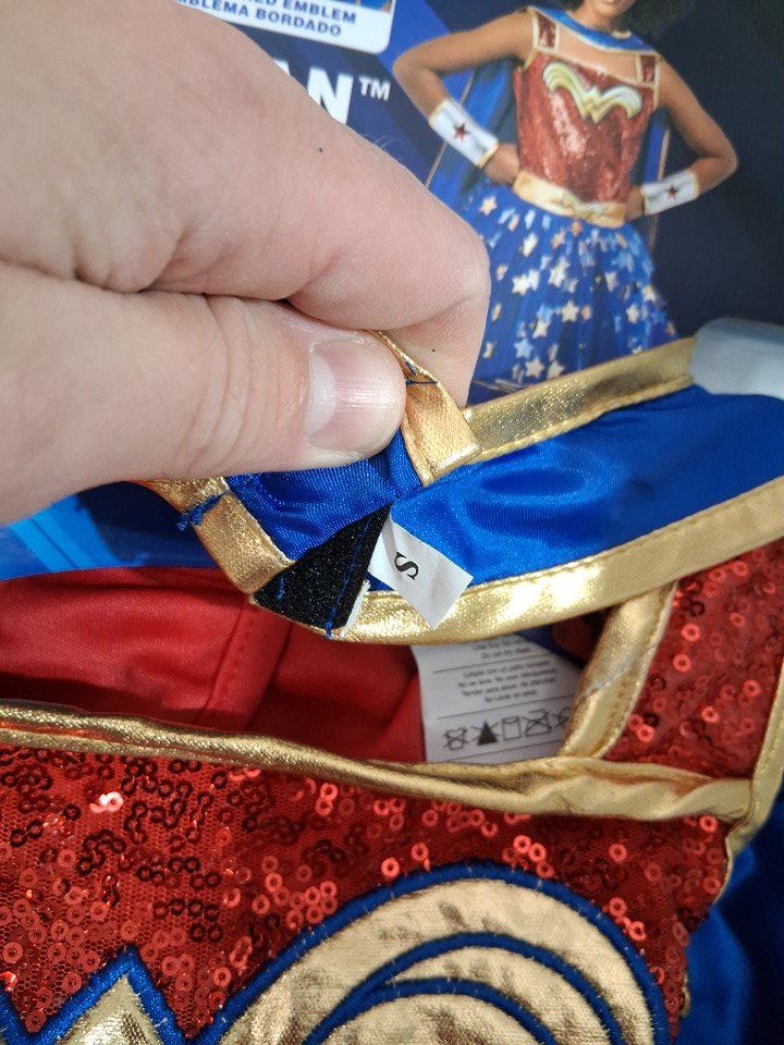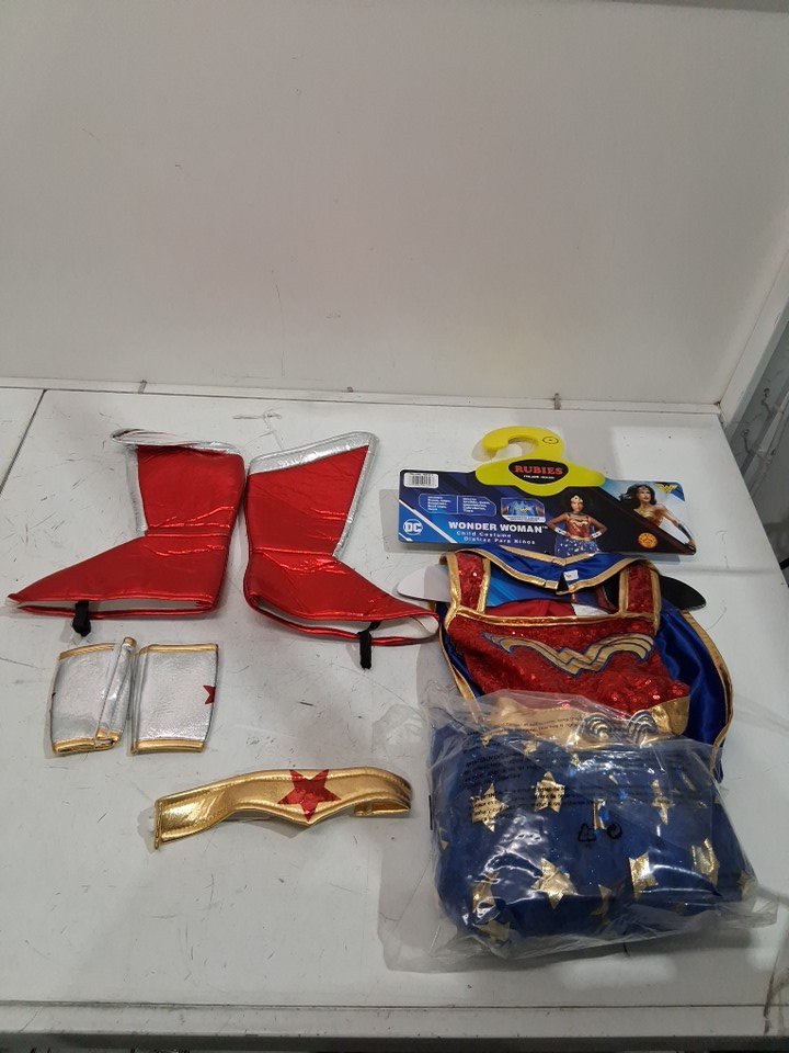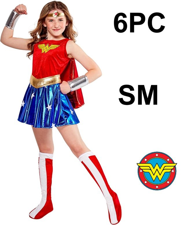 6pc Girls Rubie's DC comics Wonder Woman Costume attached cape, belt, headband, gauntlets, and boot tops - Small - red/blue