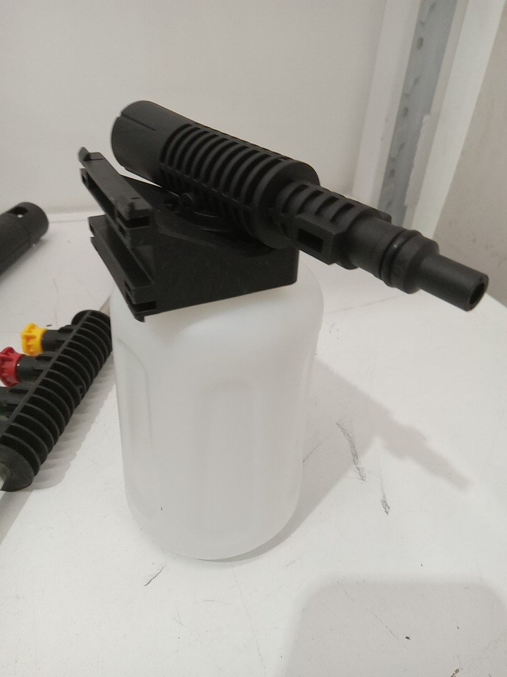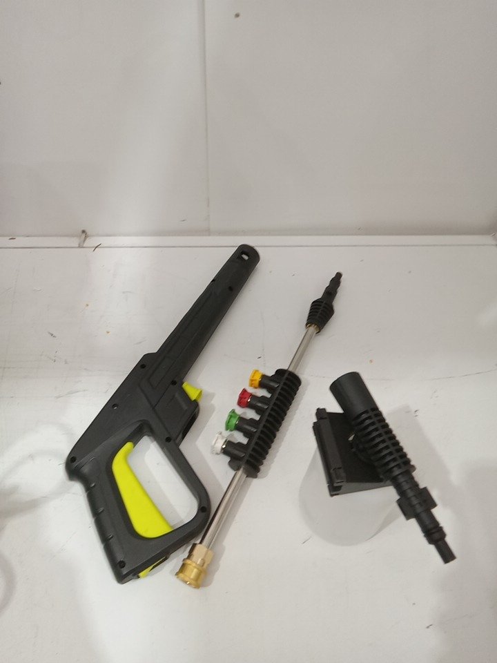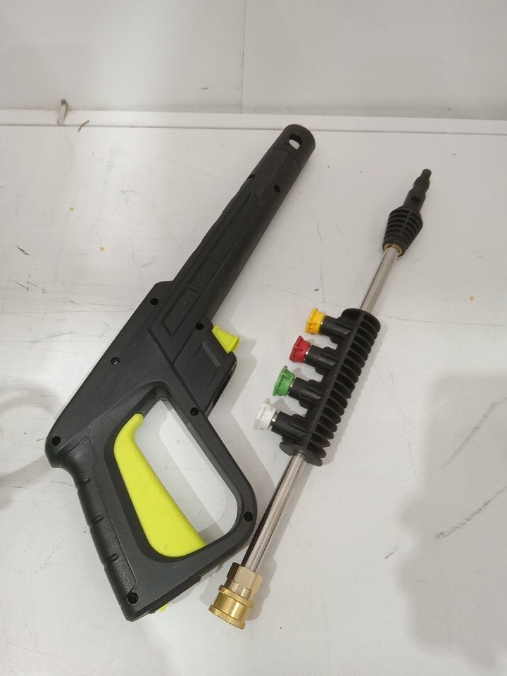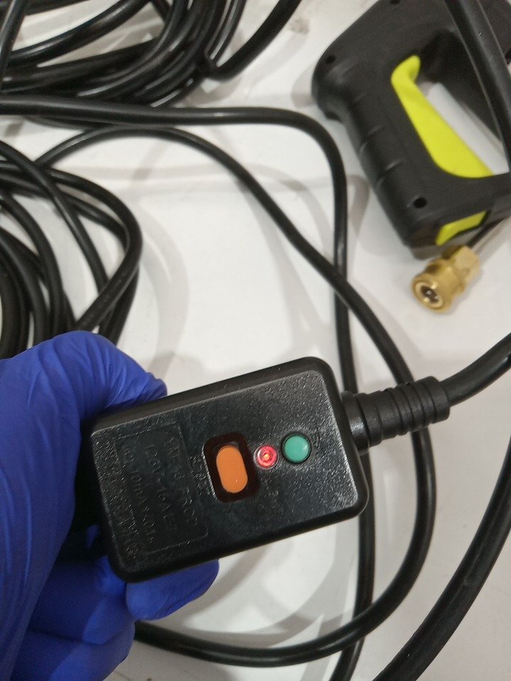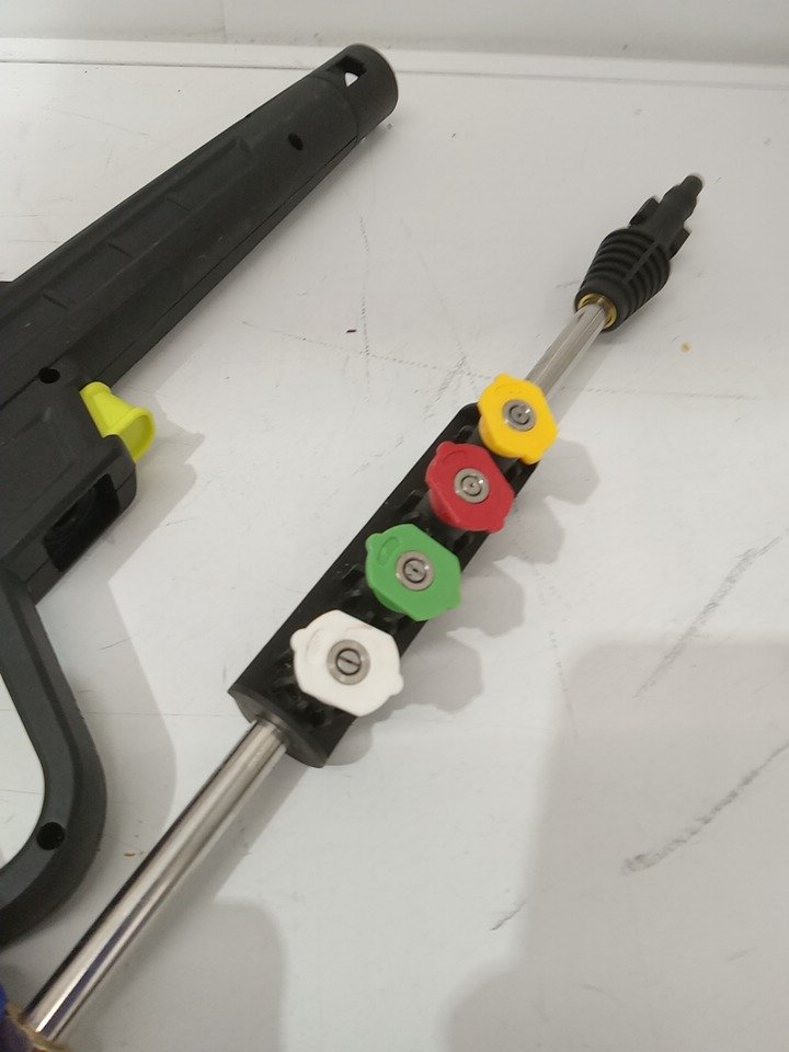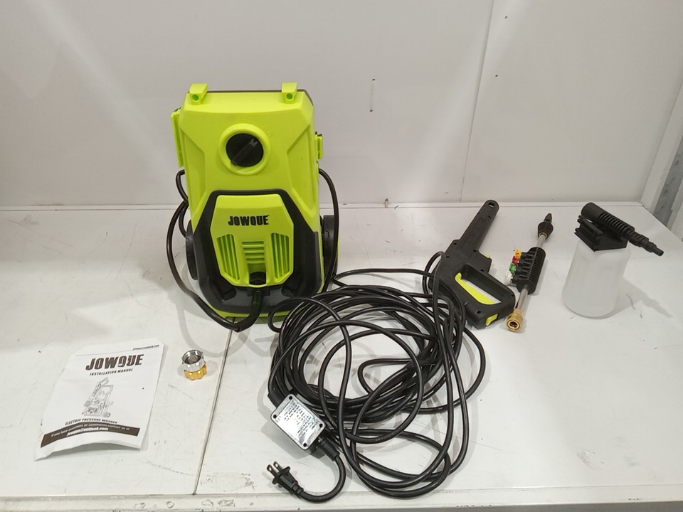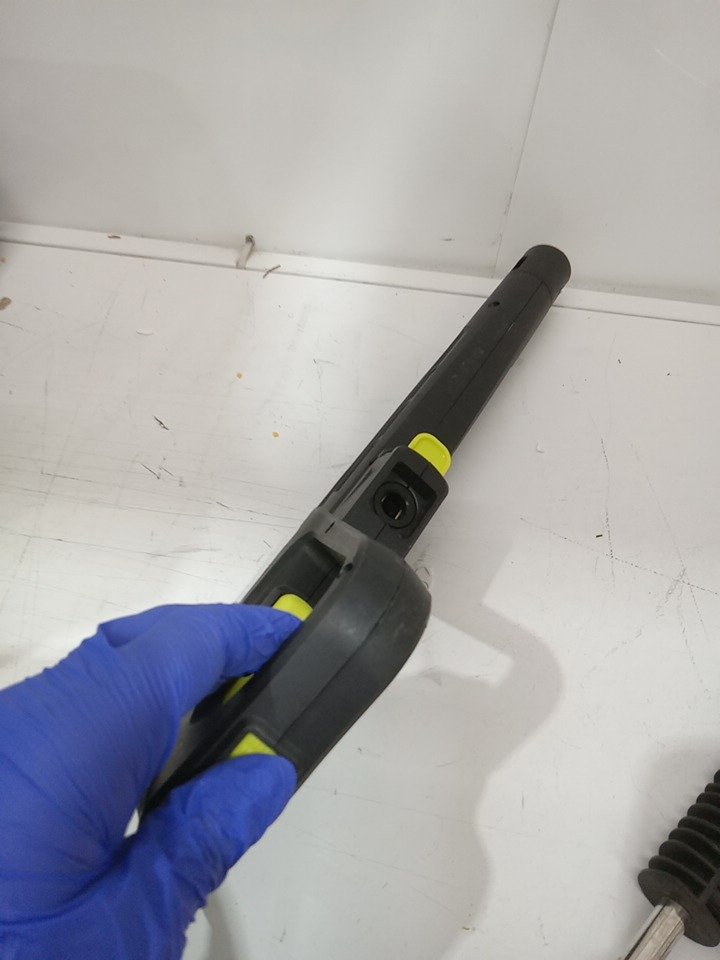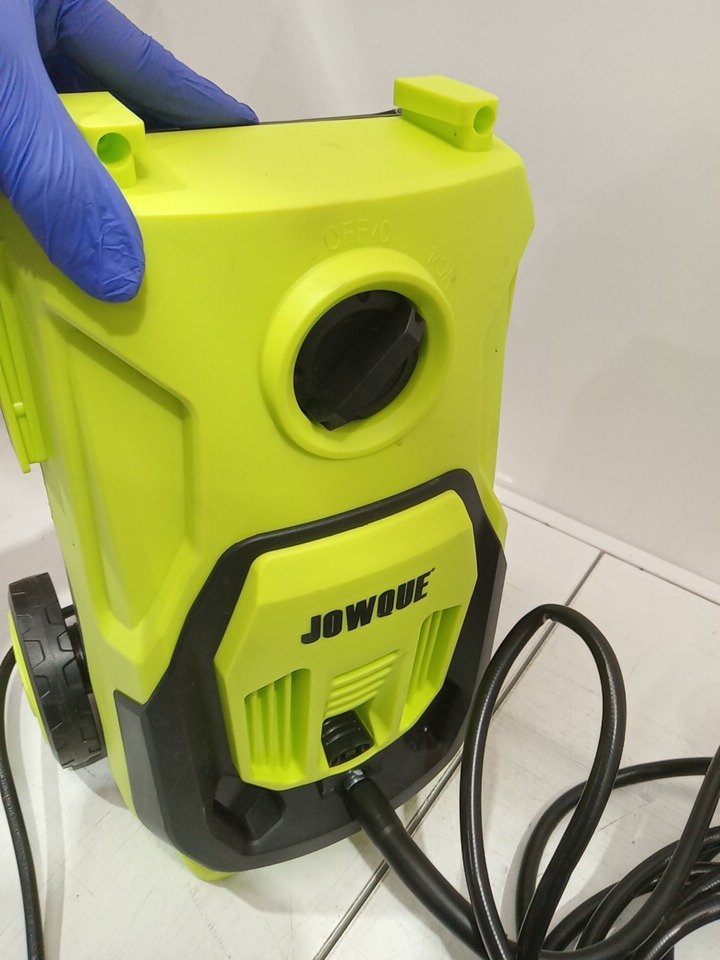 Please note that the entire handle set and white tape are missing from the original packaging. There are water stains on the hose and dirt residue on the sides from previous use. Tested for power and motor function only. (Please see photos)