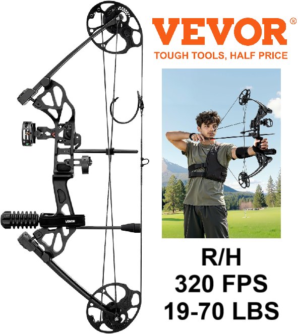 VEVOR Compound Bow Archery for Beginner - right handed - 19" - 30" draw length, 19-70lbs draw weight, 320 fps - BLACK (model: EM28)