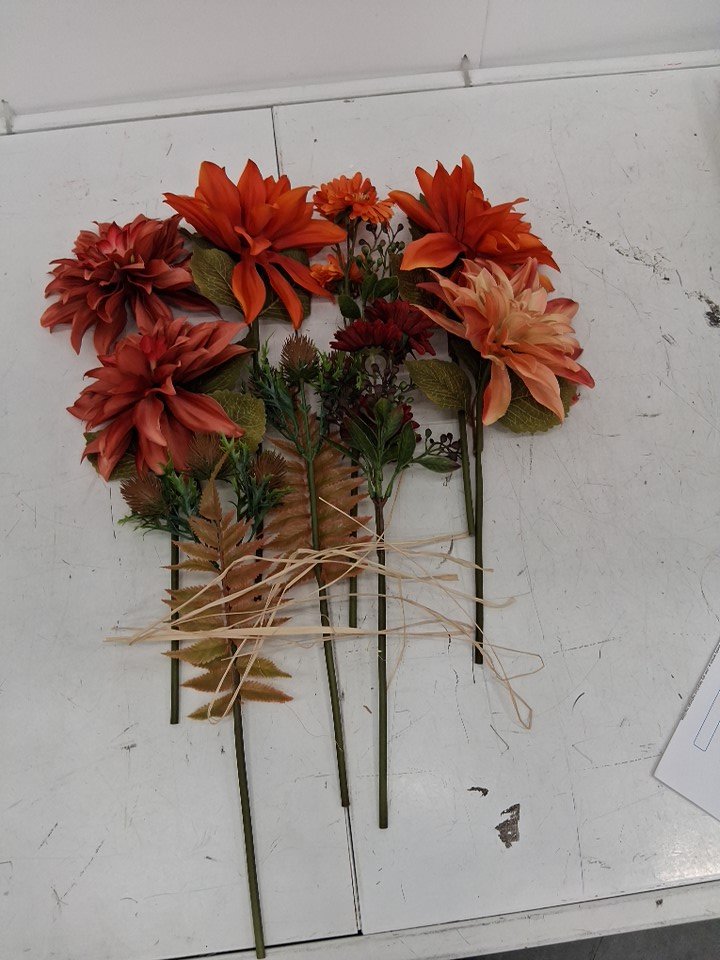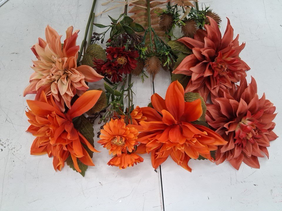 10pc AUTUMN Silk Flowers with Dahlia & Mums - RED/ ORANGE